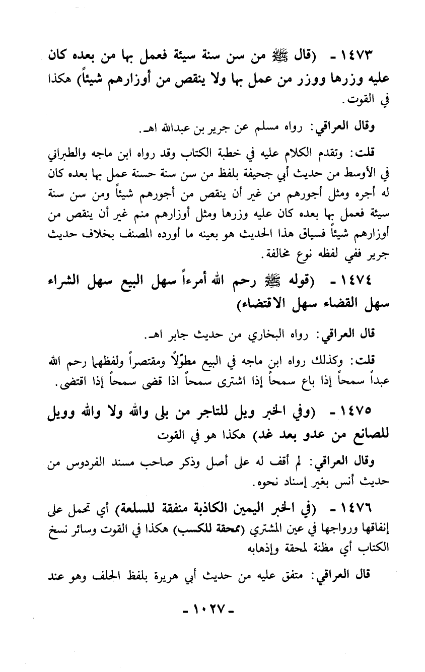 1473 - (قال - صلّى الله عليه وسلم - من سن سنة سيئة فعمل بها من بعده كان عليه وزرها ووزر من عمل بها ولا ينقص من أوزارهم شيئاً) هكذا في القوت.