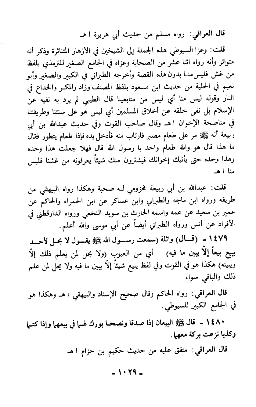 1479 - (قال) واثلة (سمعت رسول الله - صلّى الله عليه وسلم - يقول لا يحل لأحد يبيع بيعاً إلاَّ يبين ما فيه) أي من العيوب (ولا يحل لمن يعلم ذلك إلاَّ ويبينه) هكذا هو في القوت وفي لفظ يبيع شيئاً إلاَّ يبين ما فيه ولا يحل لمن علم ذلك والباقي سواء