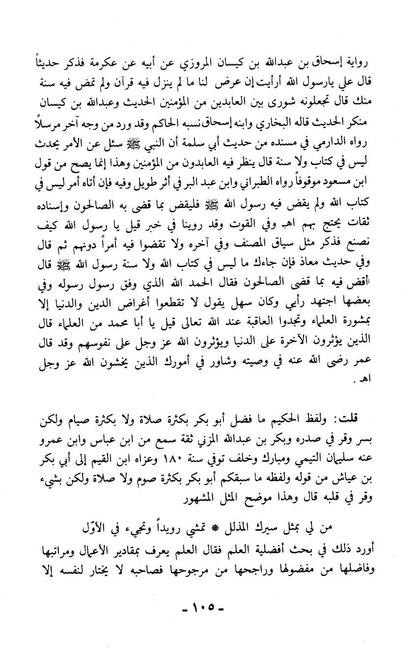 قلت: ولفظ الحكيم ما فضل أبو بكر بكثرة صلاة ولا بكثرة صيام ولكن بسر وقر فى صدره وبكر بن عبد الله المزني ثقة سمع من ابن عباس وابن عمرو عنه سليمان التيمي ومبارك وخلف توفي سنة 180 وعزاه ابن القيم إلى أبي بكر بن عياش من قوله ولفظه ما سبقكم أبو بكر بكثرة صوم ولا صلاة ولكن بشيء وقر في قلبه قال وهذا موضح المثل المشهور