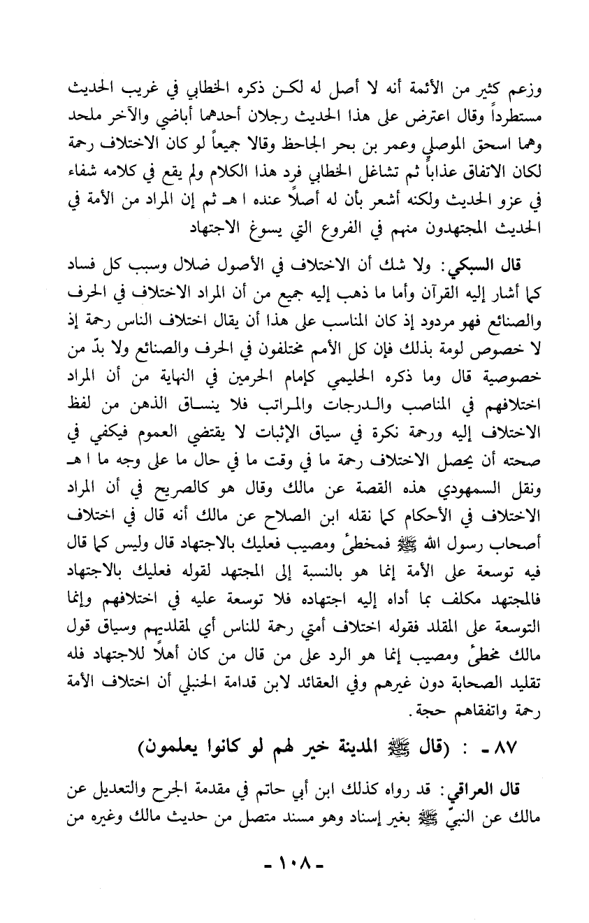 قال السبكي: ولا شك أن الاختلاف في الأصول ضلال وسبب كل فساد كما أشار إليه القرآن وأما ما ذهب إليه جميع من أن المراد الاختلاف في الحرف والصنائع فهو مردود إذ كان المناسب على هذا أن يقال اختلاف الناس رحمة إذ لا خصوص لومة بذلك فإن كل الأمم مختلفون في الحرف والصنائع ولا بدّ من خصوصية قال وما ذكره الحليمي كإمام الحرمين في النهاية من أن المراد اختلافهم في المناصب والدرجات والمراتب فلا ينساق الذهن من لفظ الاختلاف إليه ورحمة نكرة في سياق الإثبات لا يقتضي العموم فيكفي في صحته أن يحصل الاختلاف رحمة ما في وقت ما في حال ما على وجه ما اهـ ونقل السمهودي هذه القصة عن مالك وقال هو كالصريح في أن المراد الاختلاف في الأحكام كما نقله ابن الصلاح عن مالك أنه قال في اختلاف أصحاب رسول الله - صلى الله عليه وسلم - فمخطئ ومصيب فعليك بالاجتهاد قال وليس كما قال فيه توسعة على الأمة إنما هو بالنسبة إلى المجتهد لقوله فعليك بالاجتهاد فالمجتهد مكلف بما أداه إليه اجتهاده فلا توسعة عليه في اختلافهم وإنما التوسعة على المقلد فقوله اختلاف أمتي رحمة للناس أي لمقلديهم وسياق قول مالك مخطئ ومصيب إنما هو الرد على من قال من كان أهلاً للاجتهاد فله تقليد الصحابة دون غيرهم وفي العقائد لابن قدامة الحنبلي أن اختلاف الأمة رحمة واتفقاهم حجة.