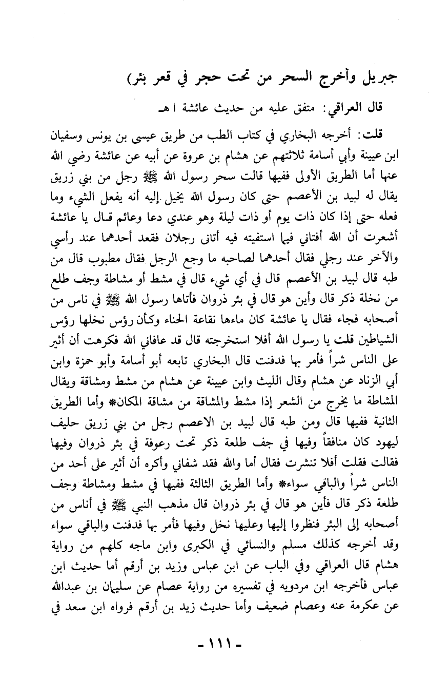 قلت: أخرجه البخاري في كتاب الطب من طريق عيسى بن يونس وسفيان ابن عيينة وأبي أسامة ثلاثتهم عن هشام بن عروة عن أبيه عن عائشة رضي الله عنها أما الطريق الأولى ففيها قالت سحر رسول الله - صلى الله عليه وسلم - رجل من بني زريق يقال له لبيد بن الأعصم حتى كان رسول الله يخيل إليه أنه يفعل الشيء وما فعله حتى إذا كان ذات يوم أو ذات ليلة وهو عندي دعا وعائم قال يا عائشة أشعرت أن الله أفتاني فيما استفيته فيه أتانى رجلان فقعد أحدهما عند رأسي والآخر عند رجلي فقال أحدهما لصاحبه ما وجع الرجل فقال مطبوب قال من طبه قال لبيد بن الأعصم قال في أي شيء قال في مشط أو مشاطة وجف طلع من نخلة ذكر قال وأين هو قال في بئر ذروان فأتاها رسول الله - صلى الله عليه وسلم - في ناس من أصحابه فجاء فقال يا عائشة كان ماءها نقاعة الحناء وكأن رؤس نخلها رؤس الشياطين قلت يا رسول الله أفلا استخرجته قال قد عافاني الله فكرهت أن أثير على الناس شراً فأمر بها فدفنت قال البخاري تابعه أبو أسامة وأبو حمزة وابن أبي الزناد عن هشام وقال الليث وابن عيينة عن هشام من مشط ومشاقة ويقال المشاطة ما يخرج من الشعر إذا مشط والمشاقة من مشاقة المكان *وأما الطريق الثانية ففيها قال ومن طبه قال لبيد بن الأعصم رجل من بني زريق حليف ليهود كان منافقاً وفيها في جف طلعة ذكر تحت رعوفة في بئر ذروان وفيها فقالت فقلت أفلا تنشرت فقال أما والله فقد شفاني وأكره أن أثير على أحد من الناس شراً والباقي سواء* وأما الطريق الثالثة ففيها في مشط ومشاطة وجف طلعة ذكر قال فأين هو قال في بئر ذروان قال مذهب النبي - صلى الله عليه وسلم - في أناس من أصحابه إلى البئر فنظروا إليها وعليها نخل وفيها فأمر بها فدفنت والباقي سواء وقد أخرجه كذلك مسلم والنسائي في الكبرى وابن ماجه كلهم من رواية هشام قال العراقي وفي الباب عن ابن عباس وزيد بن أرقم أما حديث ابن عباس فأخرجه ابن مردويه في تفسيره من رواية عصام عن سليمان بن عبد الله عن عكرمة عنه وعصام ضعيف وأما حديث زيد بن أرقم فرواه ابن سعد في