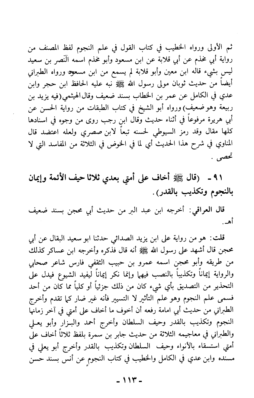 91 - (قال - صلى الله عليه وسلم - أخاف على أمتي بعدي ثلاثاً حيف الأئمة وإيمان بالنجوم وتكذيب بالقدر).
