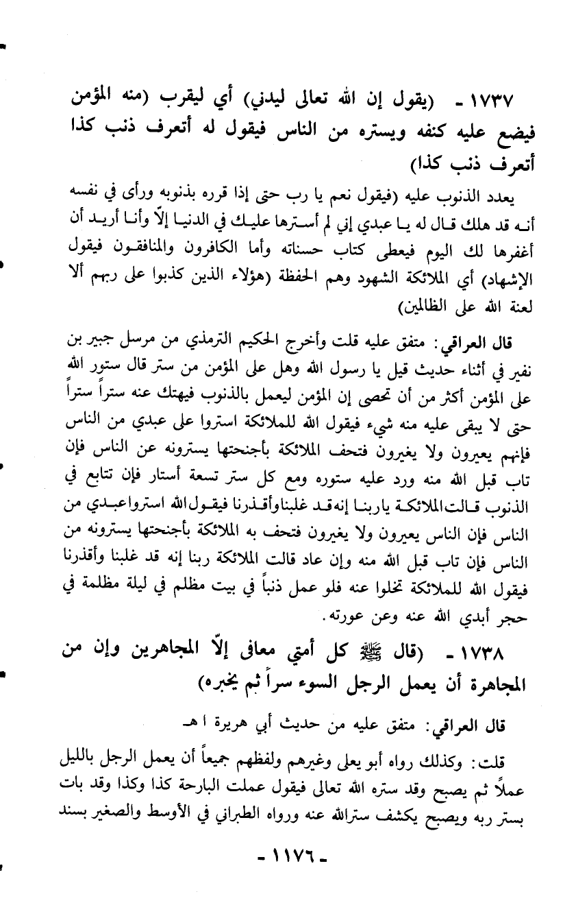 1737 - (يقول إن الله تعالى ليدني) أي ليقرب (منه المؤمن فيضع عليه كنفه ويستره من الناس فيقول له أتعرف ذنب كذا أتعرف ذنب كذا)