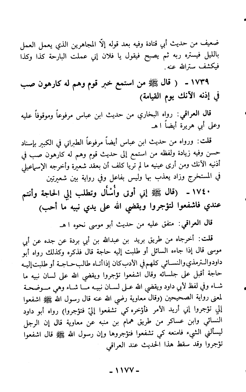 1739 - (قال - صلّى الله عليه وسلم - من استمع خبر قوم وهم له كارهون صب في إذنه الأنك يوم القيامة)