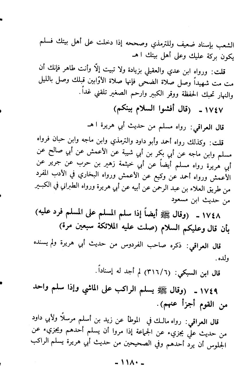 1748 - (وقال - صلّى الله عليه وسلم - أيضاً إذا سلم المسلم على المسلم فرد عليه) بأن قال وعليكم السلام (صلت عليه الملائكة سبعين مرة)