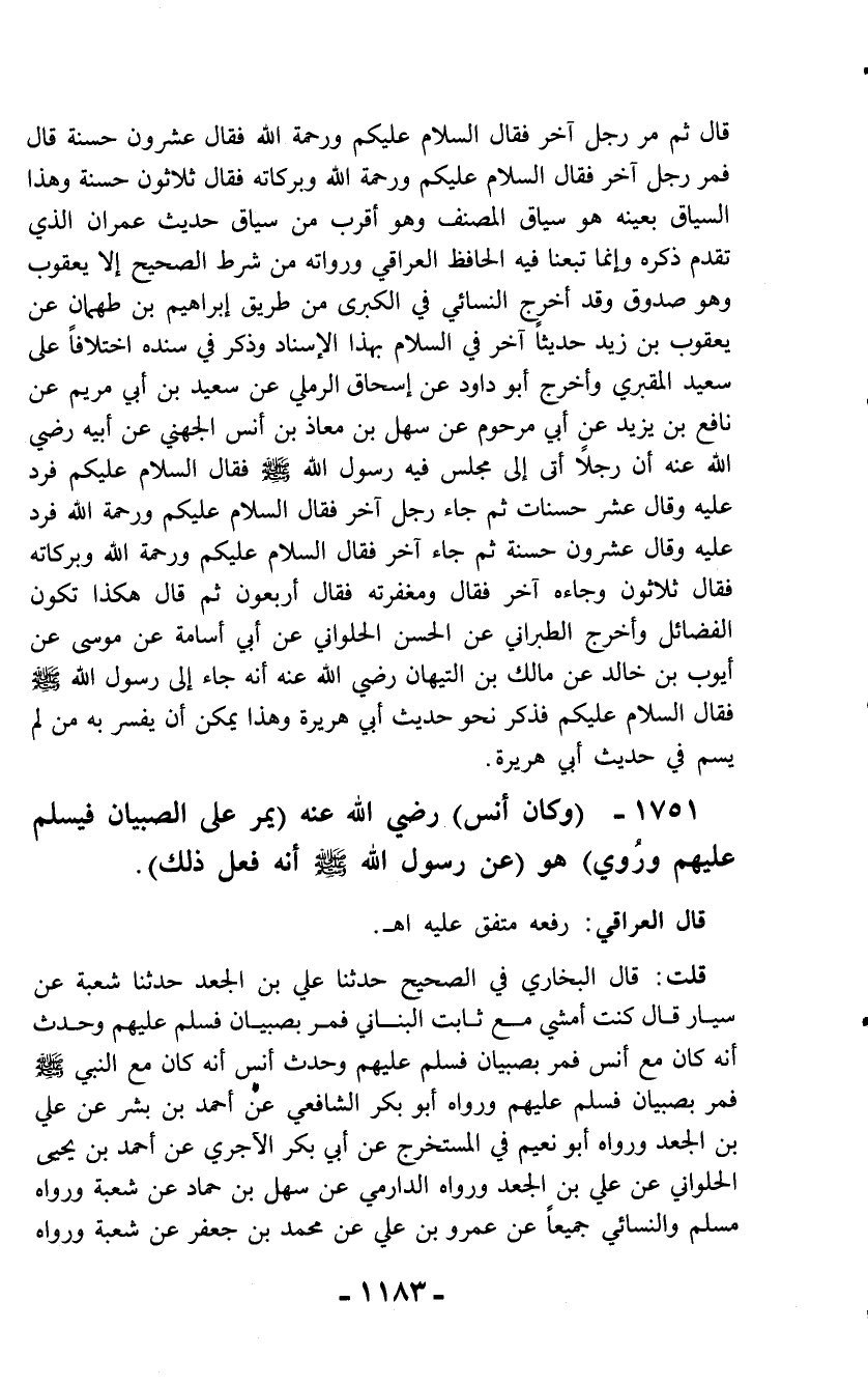1751 - (وكان أنس) رضي الله عنه (يمر على الصبيان فيسلم عليهم ورُوي) هو (عن رسول الله - صلّى الله عليه وسلم - أنه فعل ذلك).