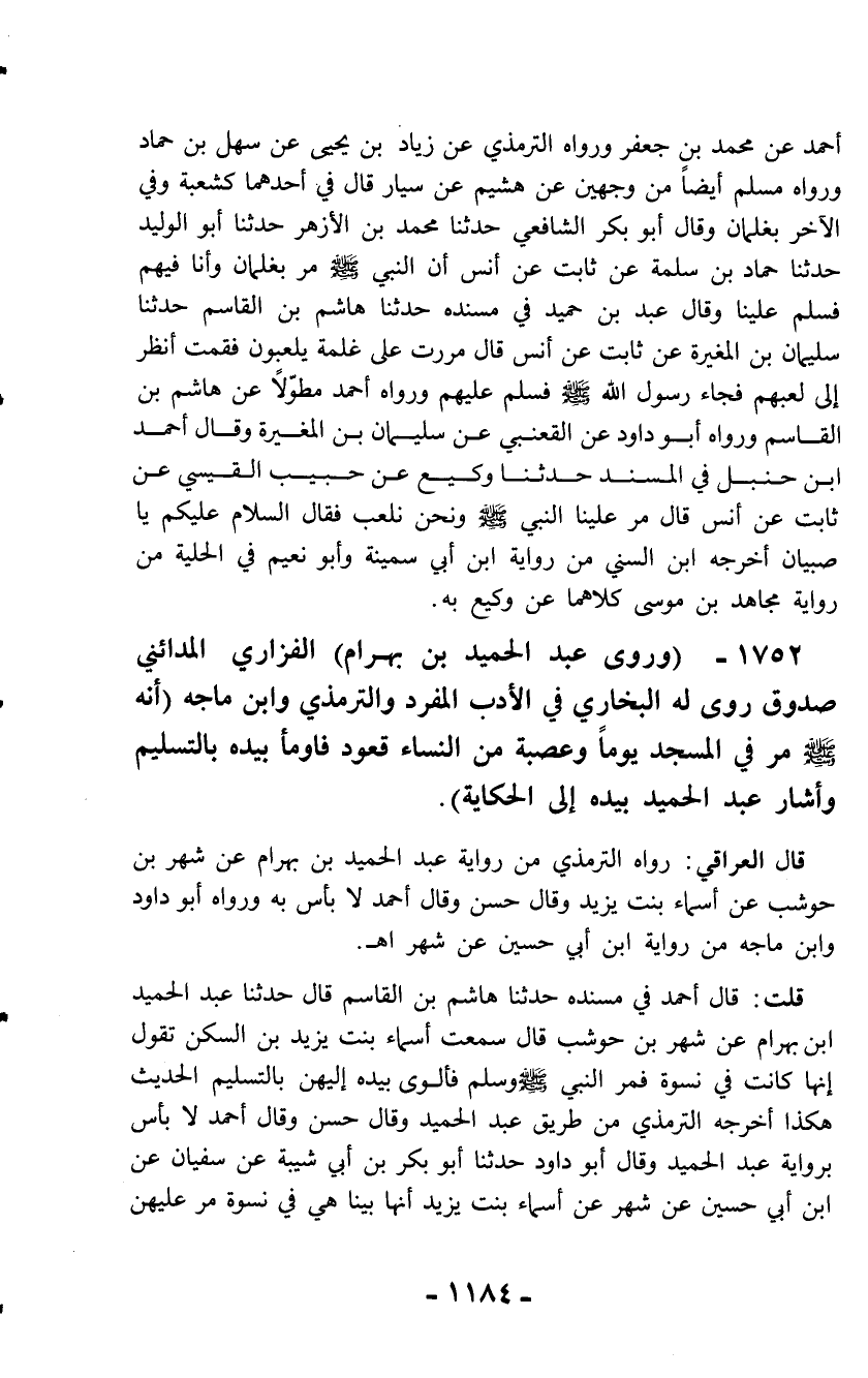1752 - (وروى عبد الحميد بن بهرام) الفزاري المدائني صدوق روى له البخاري في الأدب المفرد والترمذي وابن ماجه (أنه - صلّى الله عليه وسلم - مر في المسجد يوماً وعصبة من النساء قعود فاومأ بيده بالتسليم وأشار عبد الحميد بيده إلى الحكاية).