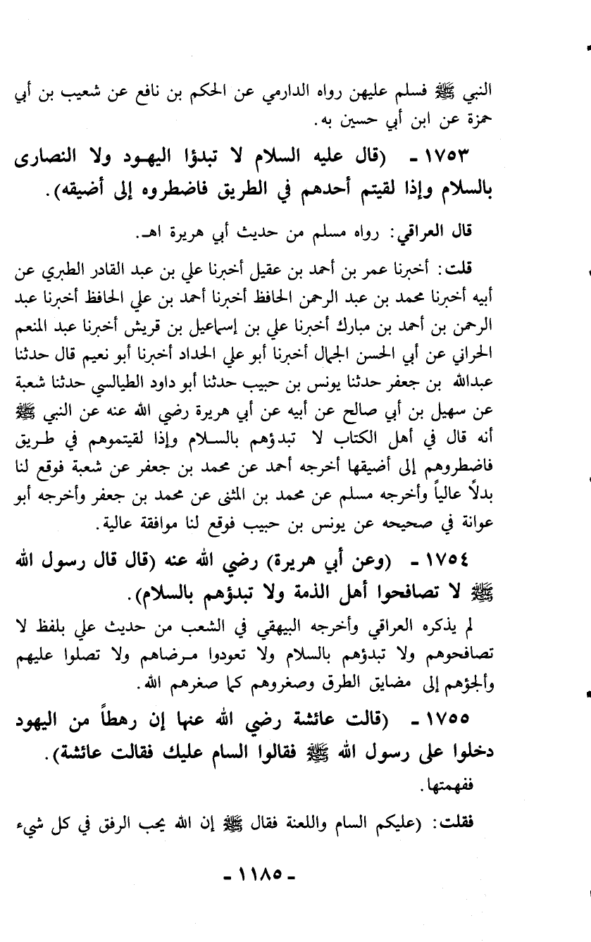 1753 - (قال عليه السلام لا تبدؤا اليهود ولا النصارى بالسلام وإذا لقيتم أحدهم في الطريق فاضطروه إلى أضيقه).