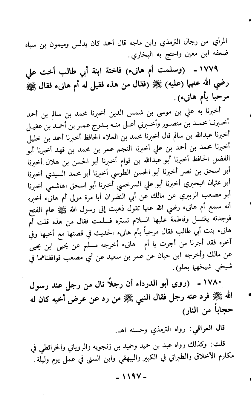1779 - (وسلمت أم هانئ) فاختة ابنة أبي طالب أخت علي رضي الله عنهما (عليه) - صلّى الله عليه وسلم - (فقال من هذه فقيل له أم هانئ فقال - صلّى الله عليه وسلم - مرحبا بأم هانئ).