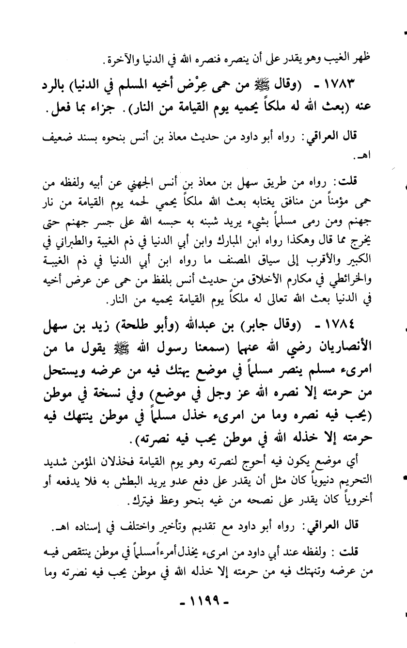 1784 - (وقال جابر) بن عبد الله (وأبو طلحة) زيد بن سهل الأنصاريان رضي الله عنهما (سمعنا رسول الله - صلّى الله عليه وسلم - يقول ما من امرئ مسلم ينصر مسلماً في موضع يهتك فيه من عرضه ويستحل من حرمته إلا نصره الله عز وجل في موضع) وفي نسخة في موطن (يحب فيه نصره وما من امرئ خذل مسلماً في موطن ينتهك فيه حرمته إلا خذله الله في موطن يحب فيه نصرته).