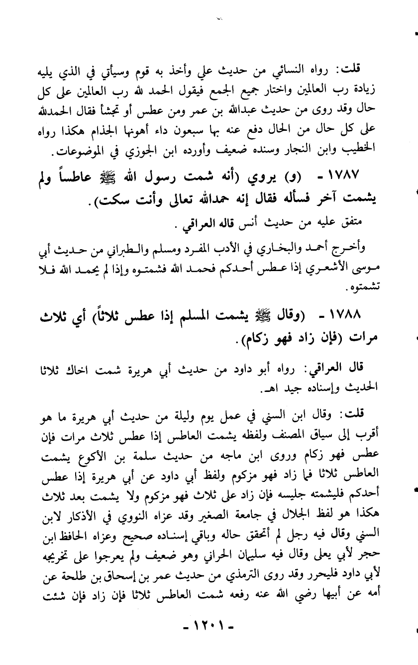 1788 - (وقال - صلّى الله عليه وسلم - يشمت المسلم إذا عطس ثلاثاً) أي ثلاث مرات (فإن زاد فهو زكام).