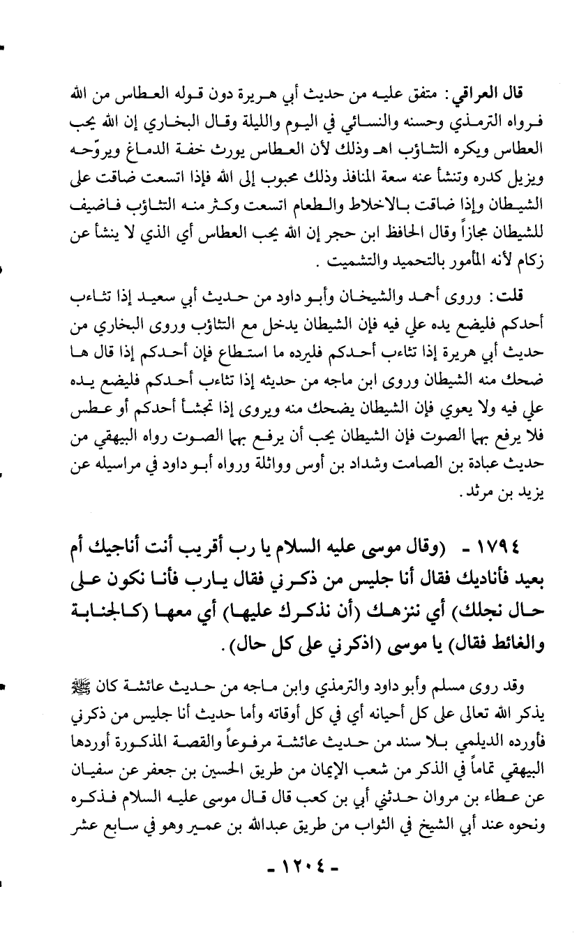 1794 - (وقال موسى عليه السلام يا رب أقريب أنت أناجيك أم بعيد فأناديك فقال أنا جليس من ذكرني فقال يا رب فأنا نكون على حال نجلك) أي ننزهك (أن نذكرك عليها) أي معها (كالجنابة والغائط فقال) يا موسى (اذكرني على كل حال).