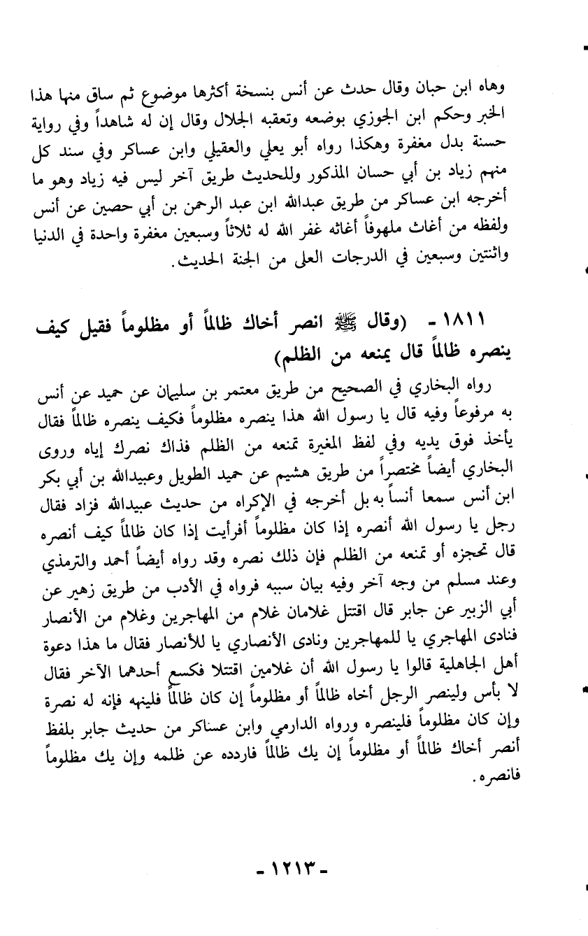 1811 - (وقال - صلّى الله عليه وسلم - انصر أخاك ظالماً أو مظلوماً فقيل كيف ينصره ظالماً قال يمنعه من الظلم)