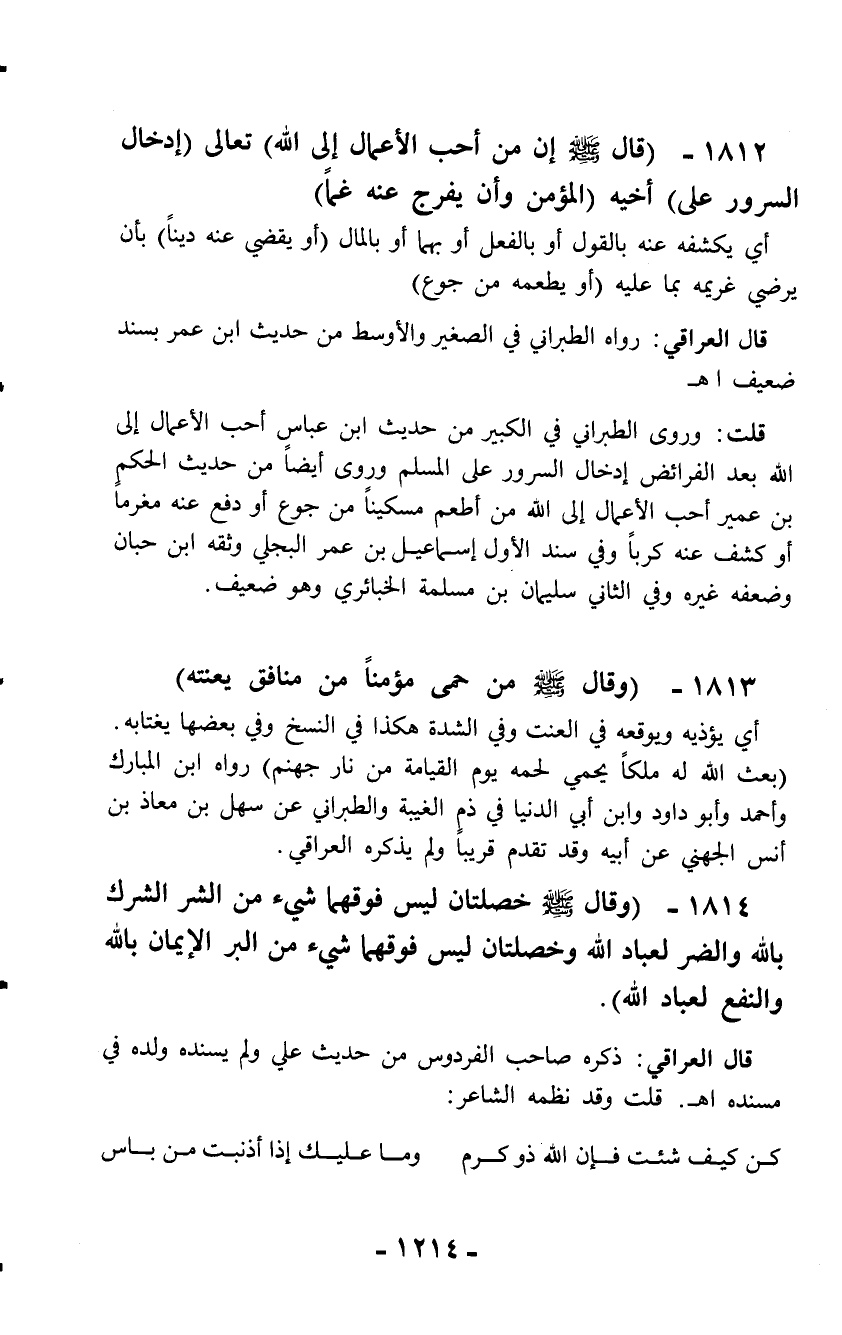 1814 - (وقال - صلّى الله عليه وسلم - خصلتان ليس فوقهما شيء من الشر الشرك بالله والضر لعباد الله وخصلتان ليس فوقهما شيء من البر الإيمان بالله والنفع لعباد الله).