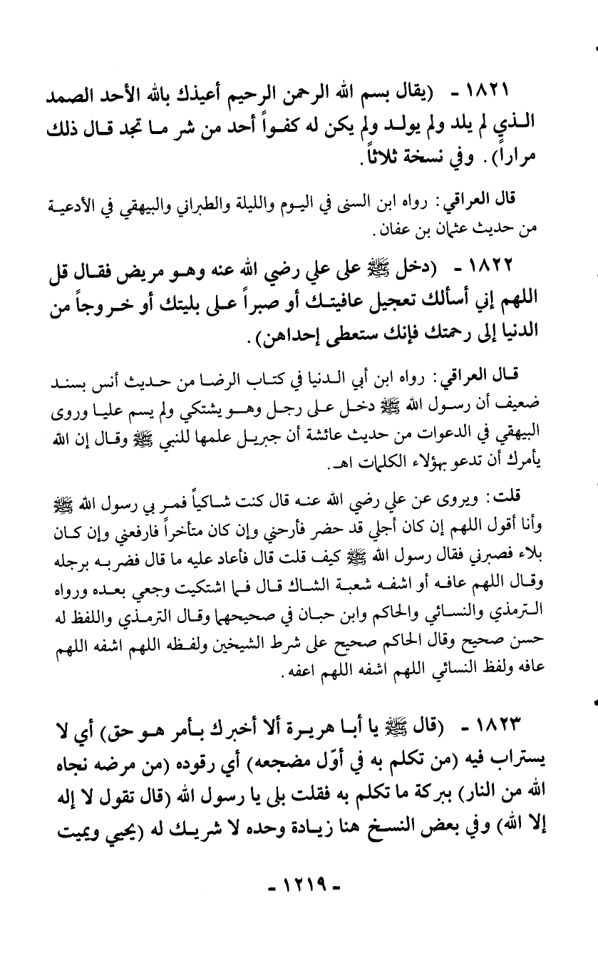 1821 - (يقال بسم الله الرحمن الرحيم أعيذك بالله الأحد الصمد الذي لم يلد ولم يولد ولم يكن له كفواً أحد من شر ما تجد قال ذلك مراراً). وفي نسخة ثلاثاً.