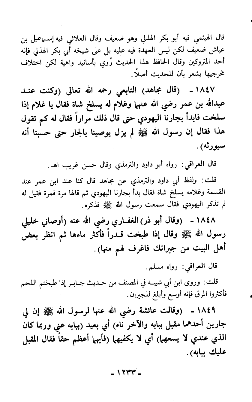 1847 - (قال مجاهد) التابعي رحمه الله تعالى (وكنت عند عبد الله بن عمر رضي الله عنهما وغلام له يسلخ شاة فقال يا غلام إذا سلخت فابدأ بجارنا اليهودي حتى قال ذلك مراراً فقال له كم تقول هذا فقال إن رسول الله - صلّى الله عليه وسلم - لم يزل يوصينا بالجار حتى حسبنا أنه سيورثه).