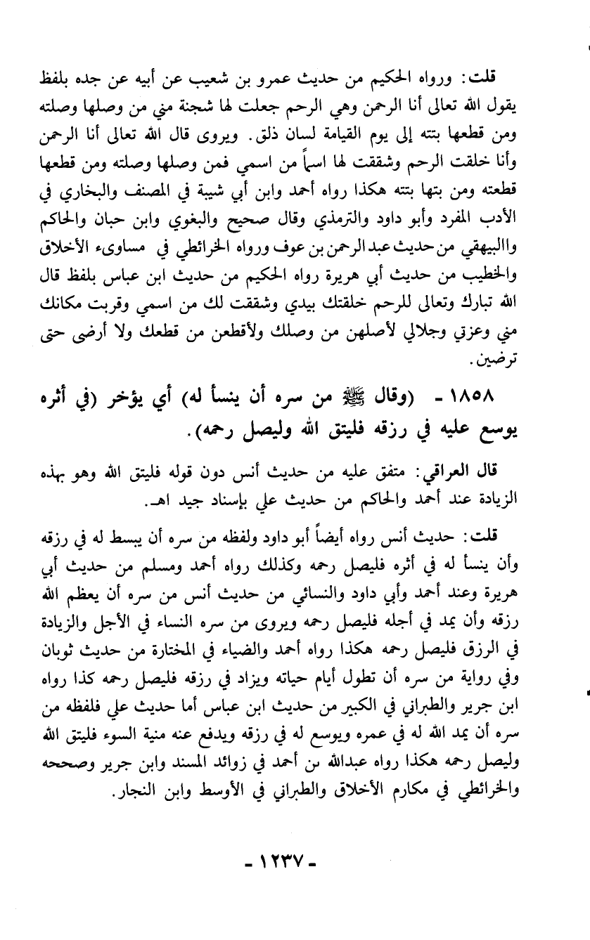 قلت: ورواه الحكيم من حديث عمرو بن شعيب عن أبيه عن جده بلفظ يقول الله تعالى أنا الرحمن وهي الرحم جعلت لها شجنة مني من وصلها وصلته ومن قطعها بتته إلى يوم القيامة لسان ذلق. ويروى قال الله تعالى أنا الرحمن وأنا خلقت الرحم وشققت لها اسماً من اسمي فمن وصلها وصلته ومن قطعها قطعته ومن بتها بتته هكذا رواه أحمد وابن أبي شيبة في المصنف والبخاري في الأدب المفرد وأبو داود والترمذي وقال صحيح والبغوي وابن حبان والحاكم والبيهقي من حديث عبد الرحمن بن عوف ورواه الخرائطي في مساوئ الأخلاق والخطيب من حديث أبي هريرة رواه الحكيم من حديث ابن عباس بلفظ قال الله تبارك وتعالى للرحم خلقتك بيدي وشققت لك من اسمي وقربت مكانك مني وعزتي وجلالي لأصلهن من وصلك ولأقطعن من قطعك ولا أرضى حتى ترضين.