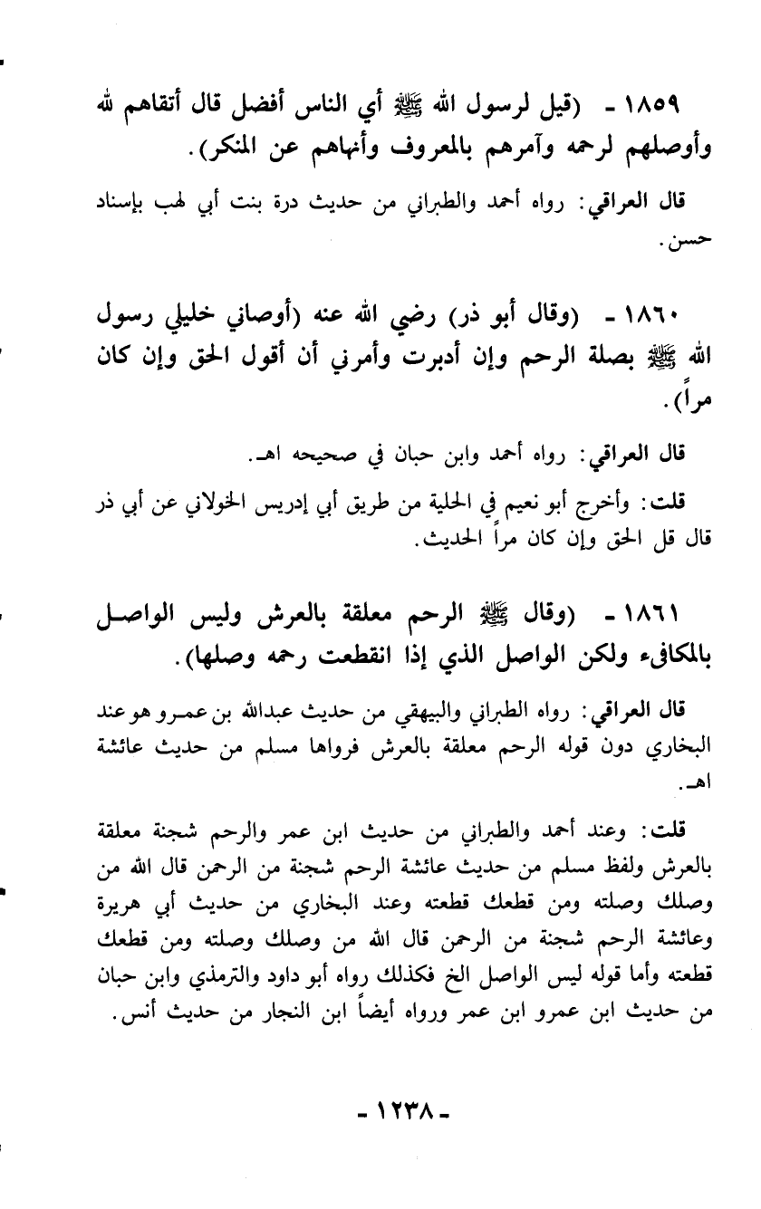 1861 - (وقال - صلّى الله عليه وسلم - الرحم معلقة بالعرش وليس الواصل بالمكافئ ولكن الواصل الذي إذا انقطعت رحمه وصلها).
