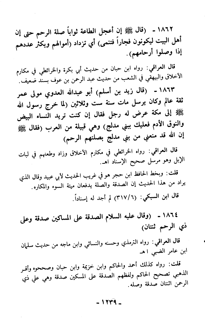 1862 - (قال - صلّى الله عليه وسلم - إن أعجل الطاعة ثواباً صلة الرحم حتى إن أهل البيت ليكونون فجاراً فتنمى) أي تزداد (أموالهم ويكثر عددهم إذا وصلوا أرحامهم).