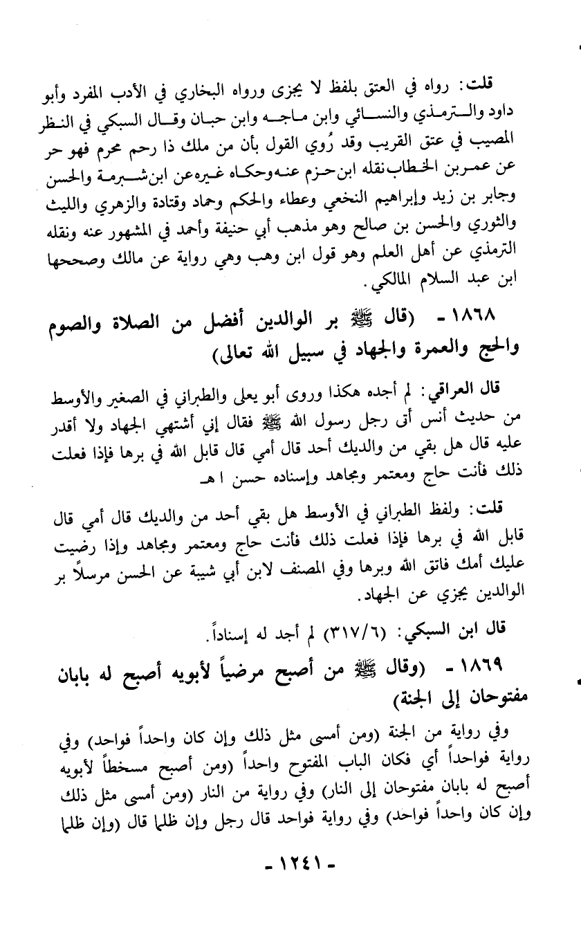 1868 - (قال - صلّى الله عليه وسلم - بر الوالدين أفضل من الصلاة والصوم والحج والعمرة والجهاد في سبيل الله تعالى)