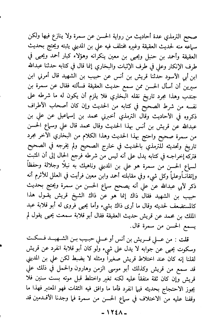 قلت: من علي قريش بن أنس أو علي حبيب بن الشهيد فسكت وسكوت يحيى عن جوابه لا يدل على شيء ولو كان أبو قلابة انفرد عن قريش لقلنا إنه كان عند اختلاط قريش صغيراً ومثله لا يضبط لكن علي بن المديني قد سمع من قريش وكذلك أبو موسى الزمن وهارون والحمل في ذلك علي قريش وإن كان ثقة متفقاً عليه لكنه تغير واختلط قبل موته بست سنين فلا يجوز الاحتجاج بحديثه فيما انفرد فأما ما وافق فيه الثقات فهو المعتبر فهذا ما وقفنا عليه من الاختلاف في سماع الحسن من سمرة فما وجدنا الأقدمين قد