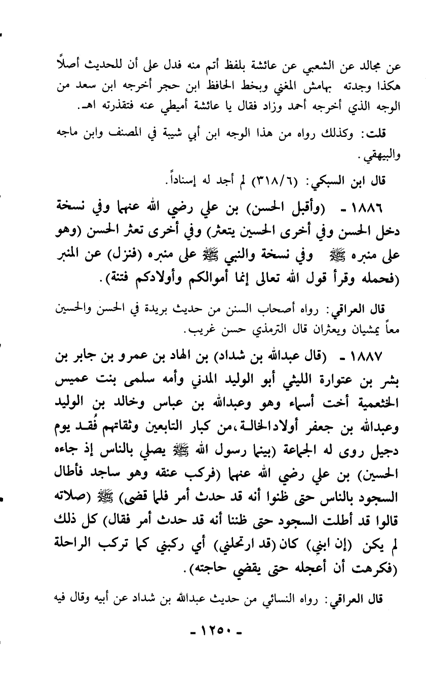 1887 - (قال عبد الله بن شداد) بن الهاد بن عمرو بن جابر بن بشر بن عتوارة الليثي أبو الوليد المدني وأمه سلمى بنت عميس الخثعمية أخت أسماء وهو وعبد الله بن عباس وخالد بن الوليد وعبد الله بن جعفر أولاد الخالة، من كبار التابعين وثقاتهم فُقد يوم دجيل روى له الجماعة (بينما رسول الله - صلّى الله عليه وسلم - يصلي بالناس إذ جاءه الحسين) بن علي رضي الله عنهما (فركب عنقه وهو ساجد فأطال السجود بالناس حتى ظنوا أنه قد حدث أمر فلما قضى) - صلّى الله عليه وسلم - (صلاته قالوا قد أطلت السجود حتى ظننا أنه قد حدث أمر فقال) كل ذلك لم يكن (إن ابني) كان (قد ارتحلني) أي ركبني كما تركب الراحلة (فكرهت أن أعجله حتى يقضي حاجته).