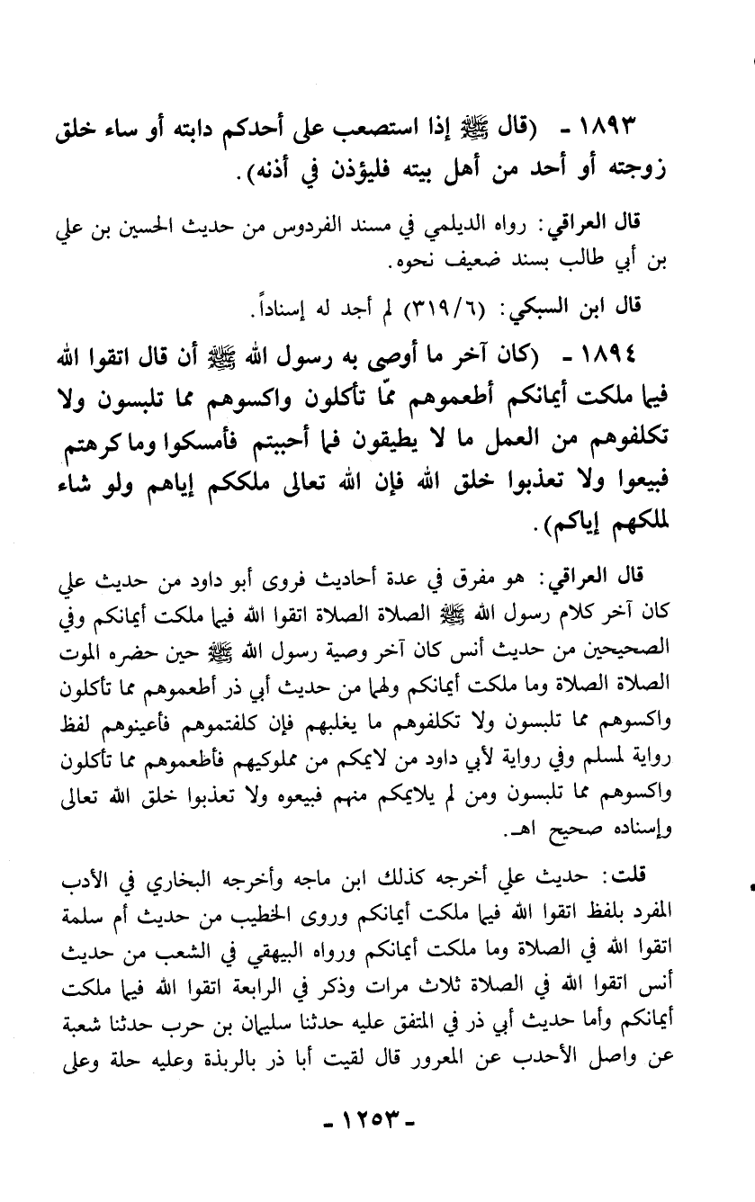 1894 - (كان آخر ما أوصى به رسول الله - صلّى الله عليه وسلم - أن قال اتقوا الله فيما ملكت أيمانكم أطعموهم ممّا تأكلون واكسوهم مما تلبسون ولا تكلفوهم من العمل ما لا يطيقون فما أحببتم فأمسكوا وماكرهتم فبيعوا ولا تعذبوا خلق الله فإن الله تعالى ملككم إياهم ولو شاء لملكهم إياكم).