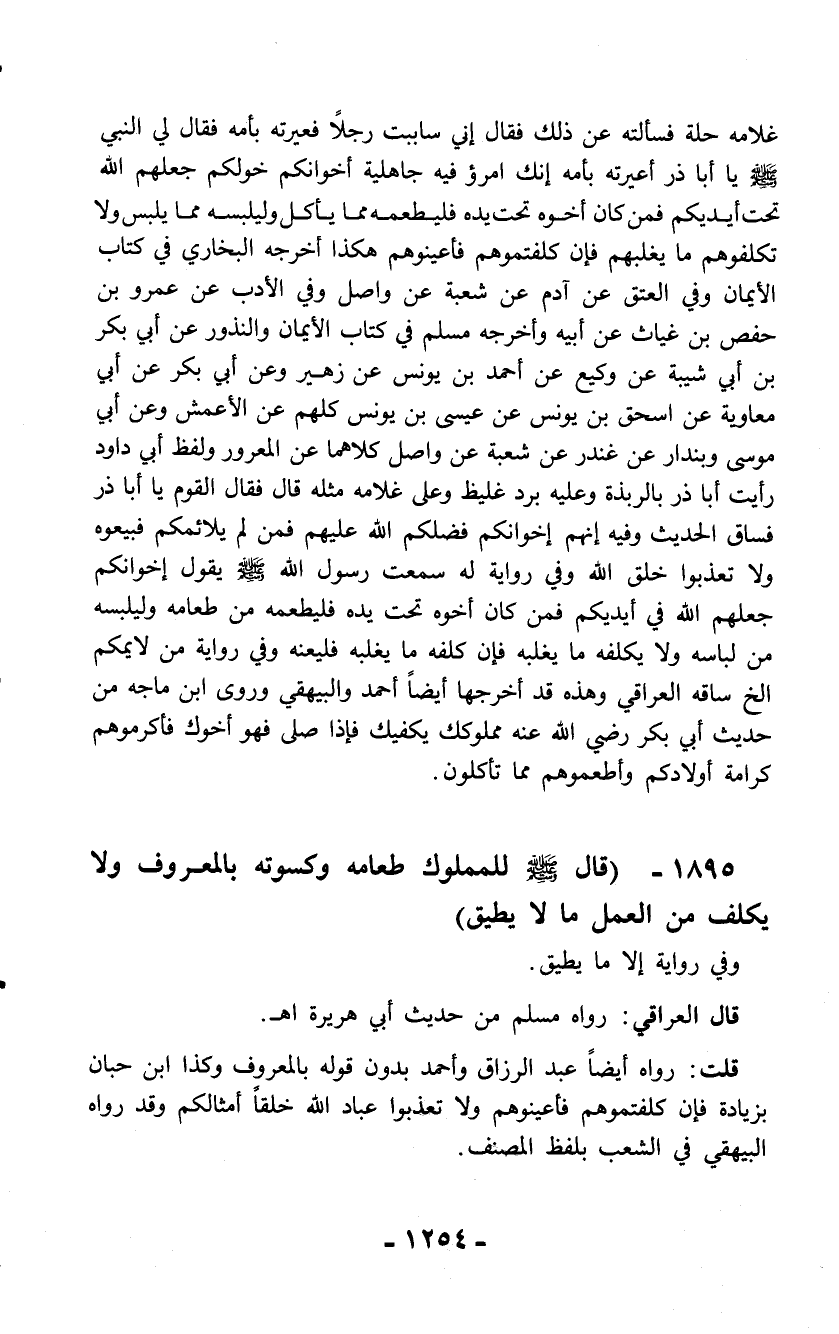 1895 - (قال - صلّى الله عليه وسلم - للمملوك طعامه وكسوته بالمعروف ولا يكلف من العمل ما لا يطيق)