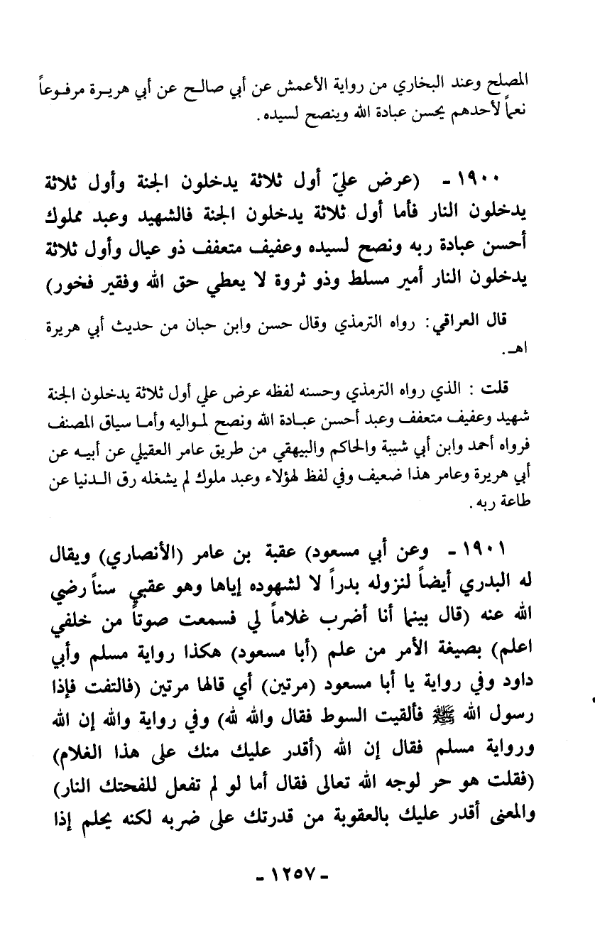 1900 - (عرض عليّ أول ثلاثة يدخلون الجنة وأول ثلاثة يدخلون النار فأما أول ثلاثة يدخلون الجنة فالشهيد وعبد مملوك أحسن عبادة ربه ونصح لسيده وعفيف متعفف ذو عيال وأول ثلاثة يدخلون النار أمير مسلط وذو ثروة لا يعطي حق الله وفقير فخور)