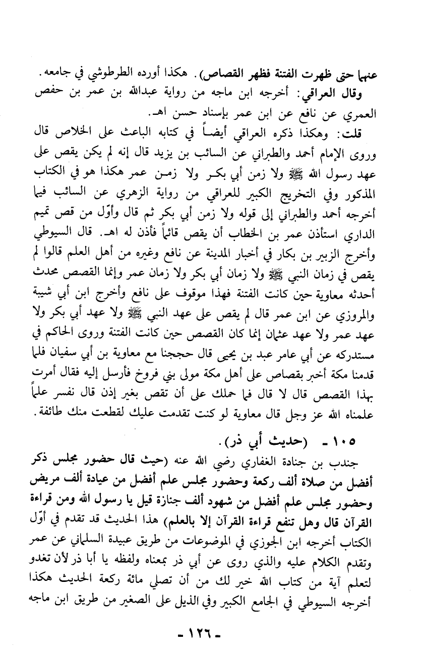 قلت: وهكذا ذكره العراقي أيضاً في كتابه الباعث على الخلاص قال وروى الإمام أحمد والطبراني عن السائب بن يزيد قال إنه لم يكن يقص على عهد رسول الله - صلى الله عليه وسلم - ولا زمن أبي بكر ولا زمن عمر هكذا هو في الكتاب المذكور وفي التخريج الكبير للعراقي من رواية الزهري عن السائب فيما أخرجه أحمد والطبراني إلى قوله ولا زمن أبي بكر ثم قال وأوّل من قص تميم الداري استأذن عمر بن الخطاب أن يقص قائماً فأذن له اهـ. قال السيوطي وأخرج الزبر بن بكار في أخبار المدينة عن نافع وغيره من أهل العلم قالوا لم يقص في زمان النبي - صلى الله عليه وسلم - ولا زمان أبي بكر ولا زمان عمر وإنما القصص محدث أحدثه معاوية حين كانت الفتنة فهذا موقوف على نافع وأخرج ابن أبي شيبة والمروزي عن ابن عمر قال لم يقص على عهد النبي - صلى الله عليه وسلم - ولا عهد أبي بكر ولا عهد عمر ولا عهد عثمان إنما كان القصص حين كانت الفتنة وروى الحاكم في مستدركه عن أبي عامر عبد بن يحيى قال حججنا مع معاوية بن أبي سفيان فلما قدمنا مكة أخبر بقصاص على أهل مكة مولى بني فروخ فأرسل إليه فقال أمرت بهذا القصص قال لا قال فما حملك على أن تقص بغير إذن قال نفسر علماً علمناه الله عز وجل قال معاوية لو كنت تقدمت عليك لقطعت منك طائفة.