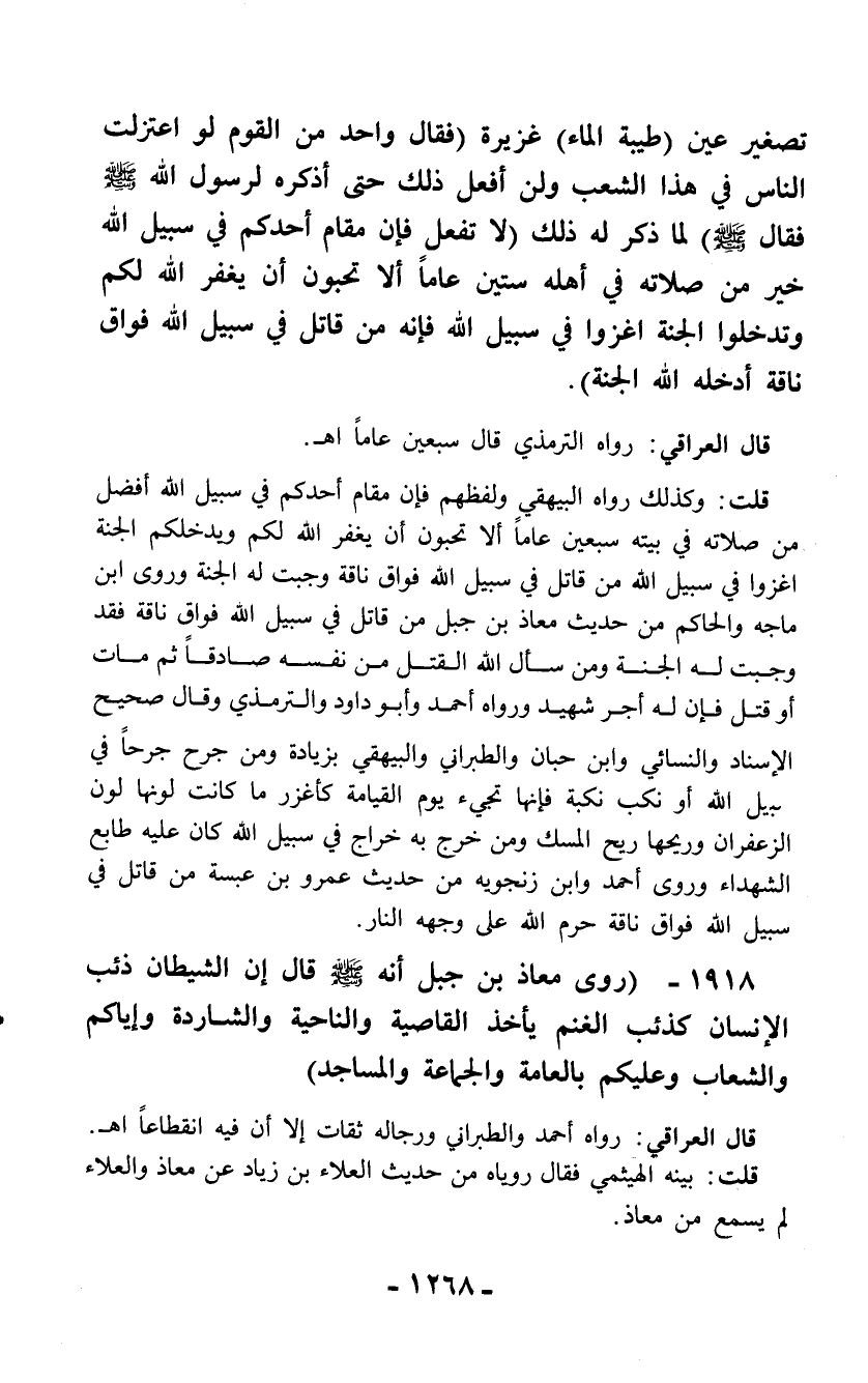 1918 - (روى معاذ بن جبل أنه - صلّى الله عليه وسلم - قال إن الشيطان ذئب الإنسان كذئب الغنم يأخذ القاصية والناحية والشاردة وإياكم والشعاب وعليكم بالعامة والجماعة والمساجد)