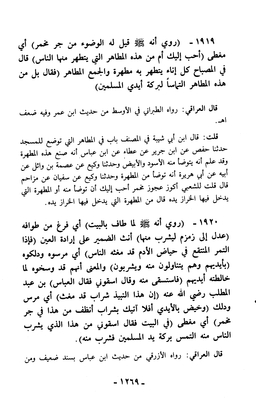 1919 - (روي أنه - صلّى الله عليه وسلم - قيل له الوضوء من جر مخمر) أي مغطى (أحب إليك أم من هذه المطاهر التي يتطهر منها الناس) قال في المصباح كل إناء يتطهر به مطهرة والجمع المطاهر (فقال بل من هذه المطاهر التماساً لبركة أيدي المسلمين)