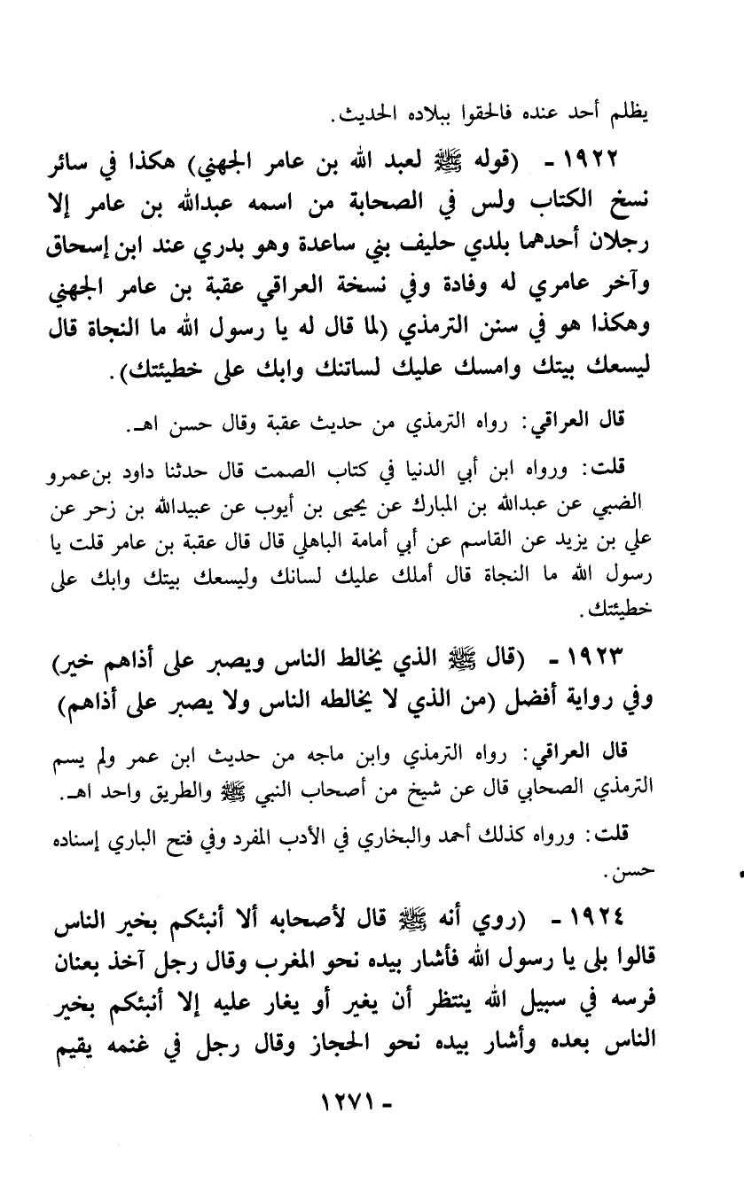 1922 - (قوله - صلّى الله عليه وسلم - لعبد الله بن عامر الجهني) هكذا في سائر نسخ الكتاب وليس في الصحابة من اسمه عبد الله بن عامر إلا رجلان أحدهما بلدي حليف بني ساعدة وهو بدري عند ابن إسحاق وآخر عامري له وفادة وفي نسخة العراقي عقبة بن عامر الجهني وهكذا هو في سنن الترمذي (لما قال له يا رسول الله ما النجاة قال ليسعك بيتك وأمسك عليك لسانك وابك على خطيئتك).