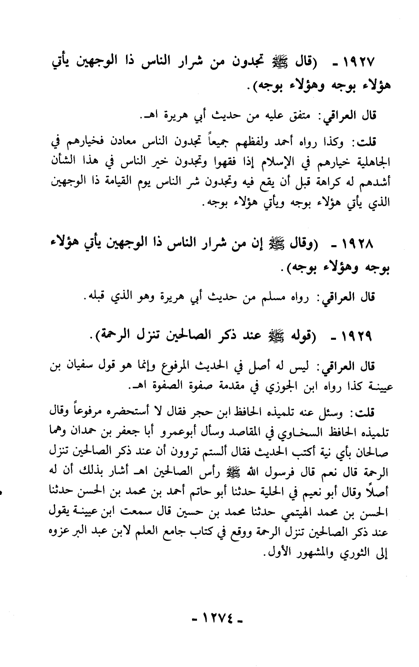 1927 - (قال - صلّى الله عليه وسلم - تجدون من شرار الناس ذا الوجهين يأتي هؤلاء بوجه وهؤلاء بوجه).