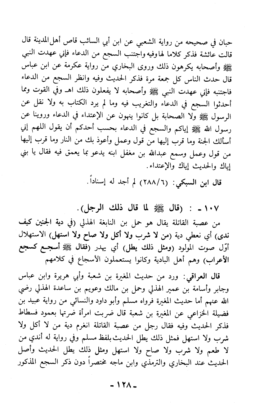 حبان في صحيحه من رواية الشعبي عن ابن أبي السائب قاص أهل المدينة قال قالت عائشة فذكر كلاما لها وفيه واجتنب السجع من الدعاء فإني عهدت النبي - صلى الله عليه وسلم - وأصحابه يكرهون ذلك وروى البخاري من رواية عكرمة عن ابن عباس قال حدث الناس كل جمعة مرة فذكر الحديث وفيه وانظر السجع من الدعاء فاجتنبه فإني عهدت النبي - صلى الله عليه وسلم - وأصحابه لا يفعلون ذلك اهـ وفي القوت ومما أحدثوا السجع في الدعاء والتغريب فيه وما لم يرد الكتاب به ولا نقل عن الرسول - صلى الله عليه وسلم - ولا الصحابة بل كانوا ينهون عن الاعتداء في الدعاء وروينا عن رسول الله - صلى الله عليه وسلم - إياكم والسجع في الدعاء بحسب أحدكم أن يقول اللهم إني أسألك الجنة وما قرب إليها من قول وعمل وأعوذ بك من النار وما قرب إليها من قول وعمل وسمع عبد الله بن مغفل ابنه يدعو بما يعمق فيه فقال يا بني إياك والحديث إياك والاعتداء.