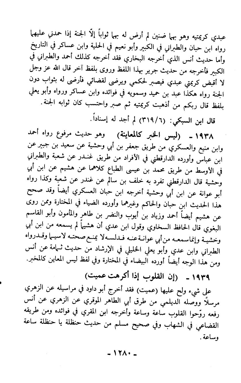 عبدي كريمتيه وهو بهما ضنين لم أرض له بهما ثواباً إلاَّ الجنة إذا حمدني عليهما رواه ابن حبان والطبراني في الكبير وأبو نعيم في الحلية وابن عساكر في التاريخ وأما حديث أنس الذي أخرجه البخاري فقد أخرجه كذلك أحمد والطبراني في الكبير فأخرجه من حديث جرير بهذا اللفظ وروى بلفظ آخر قال الله عز وجل لا أقبض كريمتي عبدي فيصبر لحكمي ويرضى لقضائي فأرضى له بثواب دون الجنة رواه هكذا عبد بن حميد وسمويه في فوائده وابن عساكر ورواه وأبو يعلي بلفظ قال ربكم من أذهبت كريمتيه ثم صبر واحتسب كان ثوابه الجنة.