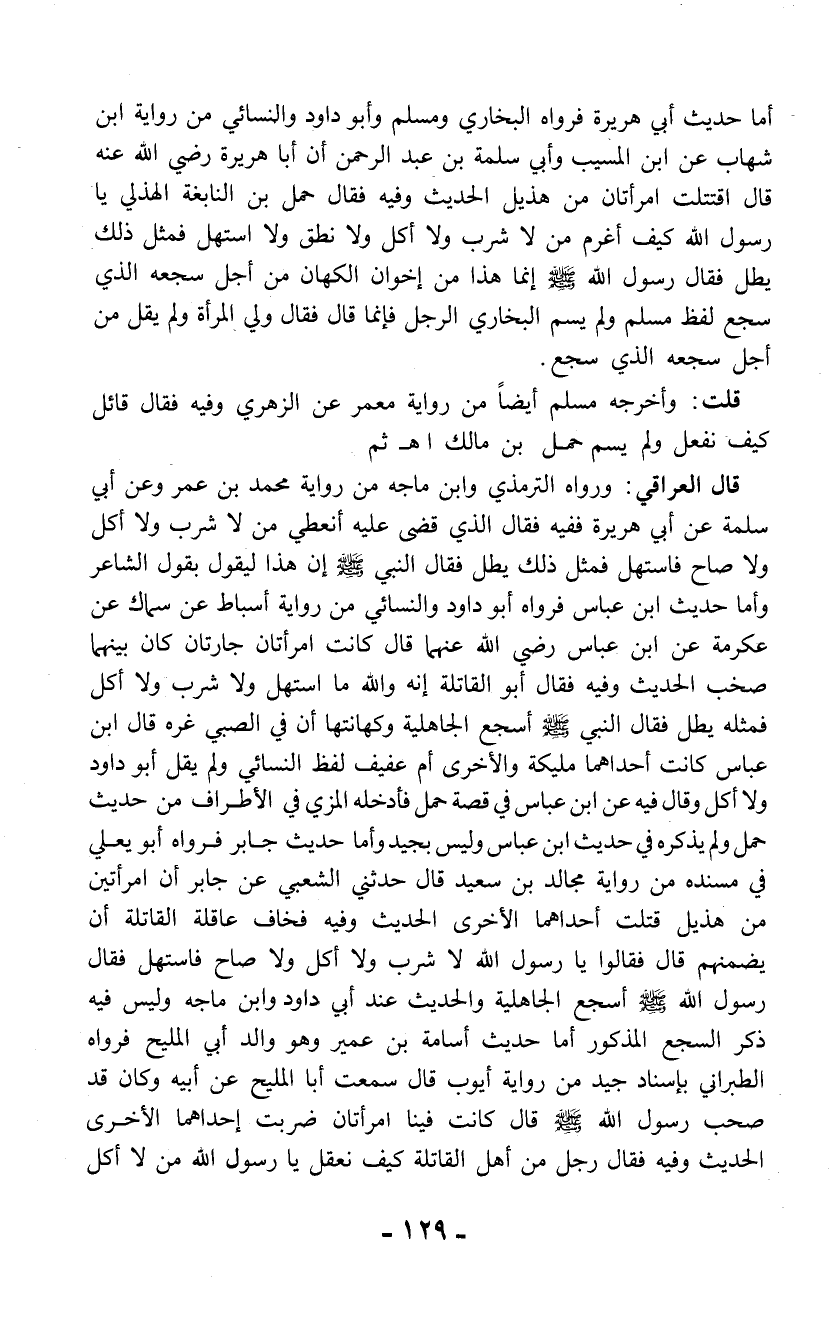 ثم قال العراقي: ورواه الترمذي وابن ماجه من رواية محمد بن عمر وعن أبي سلمة عن أبي هريرة ففيه فقال الذي قضى عليه أنعطي من لا شرب ولا أكل ولا صاح فاستهل فمثل ذلك يطل فقال النبي - صلى الله عليه وسلم - إن هذا ليقول بقول الشاعر وأما حديث ابن عباس فرواه أبو داود والنسائي من رواية أسباط عن سماك عن عكرمة عن ابن عباس رضي الله عنهما قال كانت امرأتان جارتان كان بينهما صخب الحديث وفيه فقال أبو القاتلة إنه والله ما استهل ولا شرب ولا أكل فمثله يطل فقال النبي - صلى الله عليه وسلم - أسجع الجاهلية وكهانتها أن في الصبي غره قال ابن عباس كانت أحداهما مليكة والأخرى أم عفيف لفظ النسائي ولم يقل أبو داود ولا أكل وقال فيه عن ابن عباس في قصة حمل فأدخله المزي في الأطراف من حديث حمل ولم يذكره في حديث ابن عباس وليس بجيد وأما حديث جابر فرواه أبو يعلي في مسنده من رواية مجالد بن سعيد قال حدثني الشعبي عن جابر أن امرأتين من هذيل قتلت أحداهما الأخرى الحديث وفيه فخاف عاقلة القاتلة أن يضمنهم قال فقالوا يا رسول الله لا شرب ولا أكل ولا صاح فاستهل فقال رسول الله - صلى الله عليه وسلم - أسجع الجاهلية والحديث عند أبي داود وابن ماجه وليس فيه ذكر السجع المذكور أما حديث أسامة بن عمير وهو والد أبي المليح فرواه الطبراني بإسناد جيد من رواية أيوب قال سمعت أبا المليح عن أبيه وكان قد صحب رسول الله - صلى الله عليه وسلم - قال كانت فينا امرأتان ضربت إحداهما الأخرى الحديث وفيه فقال رجل من أهل القاتلة كيف نعقل يا رسول الله من لا أكل