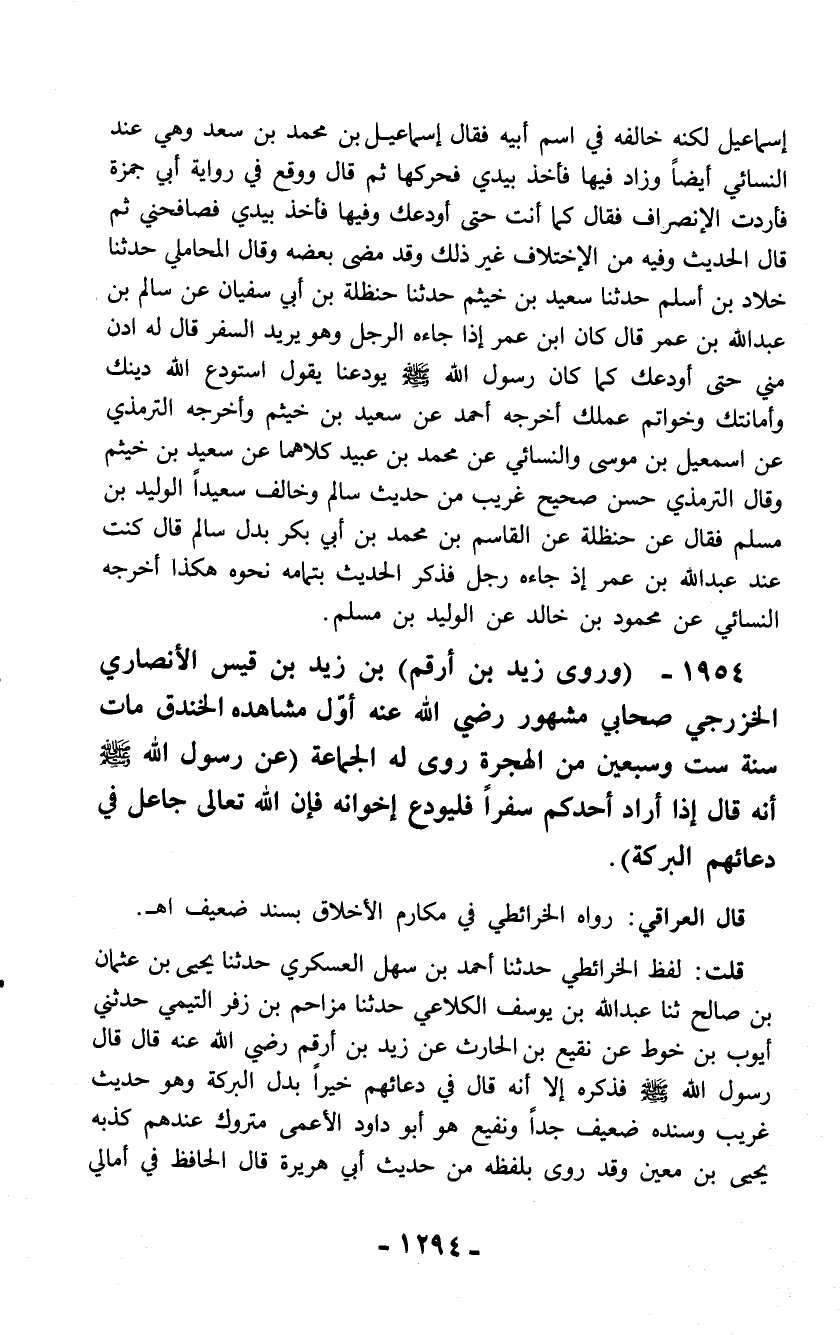 1954 - (وروى زيد بن أرقم) بن زيد بن قيس الأنصاري الخزرجي صحابي مشهور رضي الله عنه أوّل مشاهده الخندق مات سنة ست وسبعين من الهجرة روى له الجماعة (عن رسول الله - صلّى الله عليه وسلم - أنه قال إذا أراد أحدكم سفراً فليودع إخوانه فإن الله تعالى جاعل في دعائهم البركة).