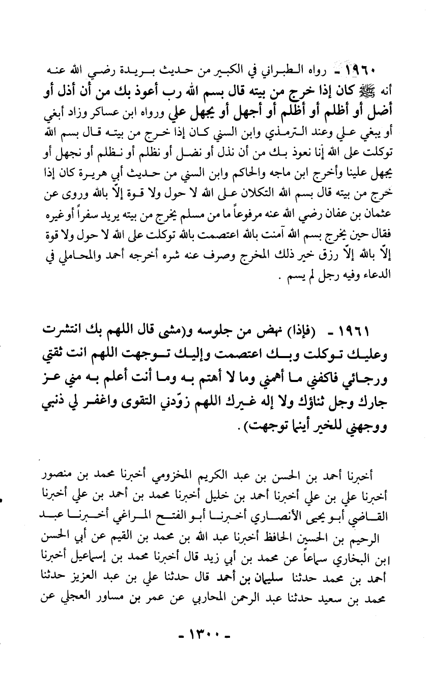 1960 - رواه الطبراني في الكبير من حديث بريدة رضي الله عنه أنه - صلّى الله عليه وسلم - كان إذا خرج من بيته قال بسم الله رب أعوذ بك من أن أذل أو أضل أو أظلم أو أظلم أو أجهل أو يجهل علي ورواه ابن عساكر وزاد أبغي أو يبغي علي وعند الترمذي وابن السني كان إذا خرج من بيته قال بسم الله توكلت على الله إنا نعوذ بك من أن نذل أو نضل أو نظلم أو نظلم أو نجهل أو يجهل علينا وأخرج ابن ماجه والحاكم وابن السني من حديث أبي هريرة كان إذا خَرج من بيته قال بسم الله التكلان على الله لا حول ولا قوة إلاَّ بالله وروى عن عثمان بن عفان رضي الله عنه مرفوعاً ما من مسلم يخرج من بيته يريد سفراً أو غيره فقال حين يخرج بسم الله آمنت بالله اعتصمت بالله توكلت على الله لا حول ولا قوة إلاّ بالله إلاَّ رزق خير ذلك المخرج وصرف عنه شره أخرجه أحمد والمحاملي في الدعاء وفيه رجل لم يسم.