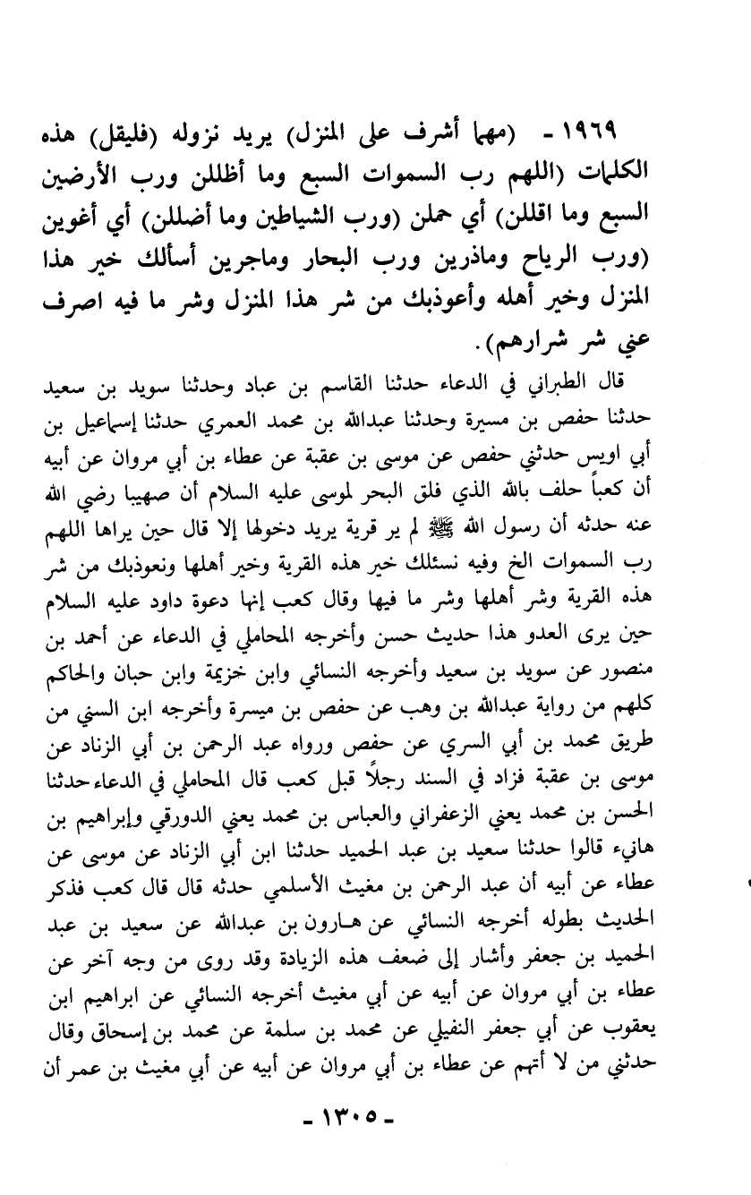 1969 - (مهما أشرف على المنزل) يريد نزوله (فليقل) هذه الكلمات (اللهم رب السماوات السبع وما أظللن ورب الأرضين السبع وما أقللن) أي حلمن (ورب الشياطين وما أضللن) أي أغوين (ورب الرياح وما ذرين ورب البحار وما جرين أسألك خير هذا المنزل وخير أهله وأعوذ بك من شر هذا المنزل وشر ما فيه اصرف عني شر شرارهم).