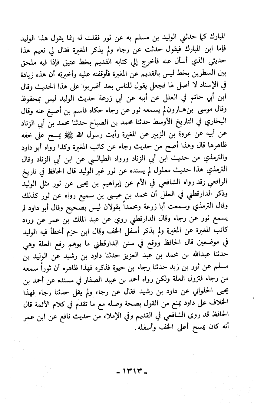 المبارك كما حدثني الوليد بن مسلم به عن ثور فقلت له إنما يقول هذا الوليد فأما ابن المبارك فيقول حدثت عن رجاء ولم يذكر المغيرة فقال لي نعيم هذا حديثي الذي أسأل عنه فأخرج إلي كتابه القديم بخط عتيق فإذا فيه ملحق بين السطرين بخط ليس بالقديم عن المغيرة فأوقفته عليه وأخبرته أن هذه زيادة في الإسناد لا أصل لها فجعل يقول للناس بعد أضربوا على هذا الحديث وقال ابن أبي حاتم في العلل عن أبيه عن أبي زرعة حديث الوليد ليس بمحفوظ وقال موسى بن هارون لم يسمعه ثور عن رجاء حكاه قاسم بن أصبغ عنه وقال البخاري في التاريخ الأوسط حدثنا محمد بن الصباح حدثنا محمد بن أبي الزناد عن أبيه عن عروة بن الزبير عن المغيرة رأيت رسول الله - صلّى الله عليه وسلم - يمسح على خفه ظاهرها قال وهذا أصح من حديث رجاء عن كاتب المغيرة وكذا رواه أبو داود والترمذي من حديث ابن أبي الزناد ورواه الطيالسي عن ابن أبي الزناد وقال الترمذي هذا حديث معلول لم يسنده عن ثور غير الوليد قال الحافظ في تاريخ الرافعي وقد رواه الشافعي في الأم عن إبراهيم بن يحيى عن ثور مثل الوليد وذكر الدارقطني في العلل أن محمد بن عيسى بن سميع رواه عن ثور كذلك وقال الترمذي وسمعت أبا زرعة ومحمداً يقولان ليس بصحيح وقال أبو داود لم يسمع ثور عن رجاء وقال الدارقطني روي عن عبد الملك بن عمر عن وراد كاتب المغيرة عن المغيرة ولم يذكر أسفل الخف وقال ابن حزم أخطأ فيه الوليد في موضعين قال الحافظ ووقع في سنن الدارقطني ما يوهم رفع العلة وهي حدثنا عبد الله بن محمد بن عبد العزيز حدثنا داود بن رشيد عن الوليد بن مسلم عن ثور بن زيد حدثنا رجاء بن حيوة فذكره فهذا ظاهره أن ثوراً سمعه من رجاء فتزول العلة ولكن رواه أحمد بن عبيد الصفار في مسنده عن أحمد بن يحيى الحلواني عن داود بن رشيد فقال عن رجاء ولم يقل حدثنا رجاء فهذا الخلاف على داود يمنع من القول بصحة وصله مع ما تقدم في كلام الأئمة قال الحافظ قد روى الشافعي في القديم وفي الإملاء من حديث نافع عن ابن عمر أنه كان يمسح أعلى الخف وأسفله.