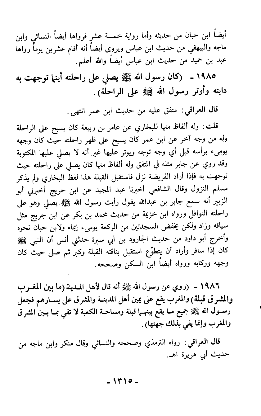 1985 - (كان رسول الله - صلّى الله عليه وسلم - يصلي على راحلته أينما توجهت به دابته وأوتر رسول الله - صلّى الله عليه وسلم - على الراحلة).
