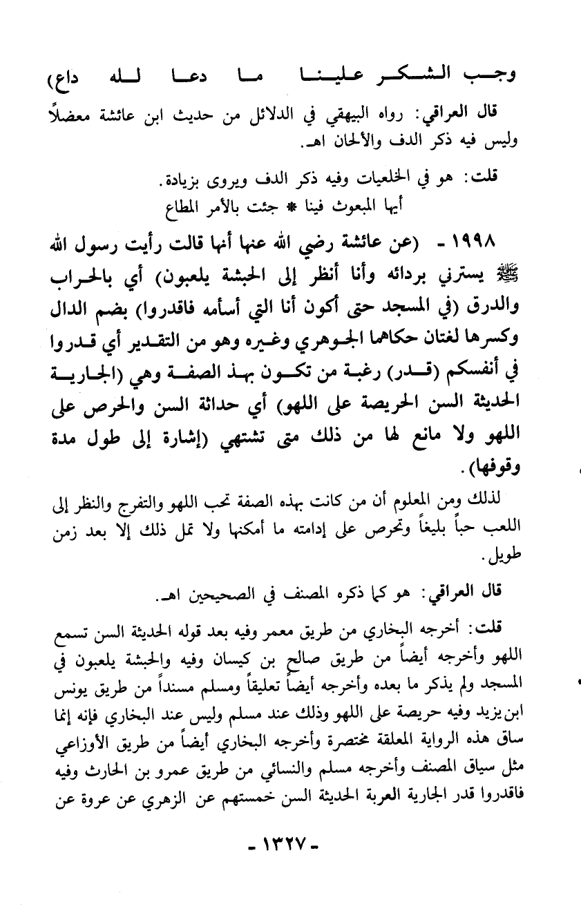 1998 - (عن عائشة رضي الله عنها أنها قالت رأيت رسول الله - صلّى الله عليه وسلم - يسترني بردائه وأنا أنظر إلى الحبشة يلعبون) أي بالحراب والدرق (في المسجد حتى أكون أنا التي أسأمه فاقدروا) بضم الدال وكسرها لغتان حكاهما الجوهري وغيره وهو من التقدير أي قدروا في أنفسكم (قدر) رغبة من تكون بهذ الصفة وهي (الجارية الحديثة السن الحريصة على اللهو) أي حداثة السن والحرص على اللهو ولا مانع لها من ذلك متى تشتهي (إشارة إلى طول مدة وقوفها).