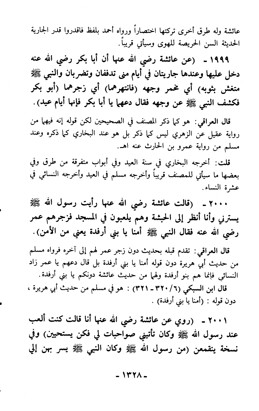 2000 - (قالت عائشة رضي الله عنها رأيت رسول الله - صلّى الله عليه وسلم - يسترني وأنا أنظر إلى الحبشة وهم يلعبون في المسجد فزجرهم عمر رضي الله عنه فقال النبي - صلّى الله عليه وسلم - أمنا يا بني أرفدة يعني من الأمن).