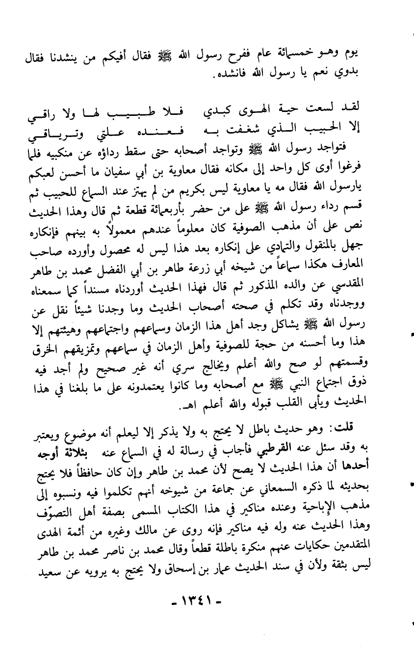 قلت: وهو حديث باطل لا يحتج به ولا يذكر إلا ليعلم أنه موضوع ويعتبر به وقد سئل عنه القرطبي فأجاب في رسالة له في السماع عنه بثلاثة أوجه أحدها أن هذا الحديث لا يصح لأن محمد بن طاهر وإن كان حافظاً فلا يحتج بحديثه لما ذكره السمعاني عن جماعة من شيوخه أنهم تكلموا فيه ونسبوه إلى مذهب الإباحية وعنده مناكير في هذا الكتاب المسمى بصفة أهل التصوّف وهذا الحديث عنه وله فيه مناكير فإنه روى عن مالك وغيره من أئمة الهدى المتقدمين حكايات عنهم منكرة باطلة قطعاً وقال محمد بن ناصر محمد بن طاهر ليس بثقة ولأن في سند الحديث عمار بن إسحاق ولا يحتج به يرويه عن سعيد
