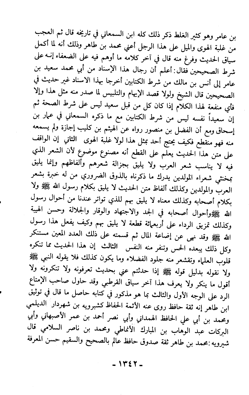 بن عامر وهو كثير الغلط ذكر ذلك كله ابن السمعاني في تاريخه قال ثم العجب من غلبة الهوى والميل على هذا الرجل أعني محمد بن طاهر وذلك أنه لما أكمل سياق الحديث وفرغ منه قال في آخر كلامه ما أوهم فيه على الضعفاء إنه على شرط الصحيحين فقال: أعلم أن رجال هذا الإسناد من أبي محمد سعيد بن عامر إلى أنس بن مالك من شرط الكتابين أخرجا بهذا الإسناد غير حديث في الصحيحين قال الشيخ ولولا قصد الإيهام والتلبيس لما صدر منه مثل هذا وإلا فأي منفعة لهذا الكلام إذا كان كل من قبل سعيد ليس على شرط الصحة ثم إن سعيداً نفسه ليس من شرط الكتابين مع ما ذكره السمعاني في عمار بن إسحاق ومع أن الفضل بن منصور رواه عن الهيثم بن كليب إجازة ولم يسمعه منه فهو منقطع فكيف يحتج أحد بمثل هذا لولا غلبة الهوى الثاني إن الواقف على متن هذا الحديث يعلم على القطع أنه مصنوع موضوع لأن الشعر الذي فيه لا يناسب شعر العرب ولا يليق بجزالة شعرهم وألفاظهم وإنما يليق بمخنثي شعراء المولدين يدرك ما ذكرناه بالذوق الضروري من له خبرة بشعر العرب والمولدين وكذلك ألفاظ متن الحديث لا يليق بكلام رسول الله - صلّى الله عليه وسلم - ولا بكلام أصحابه وكذلك معناه لا يليق بهم للذي تواتر عندنا من أحوال رسول الله - صلّى الله عليه وسلم - وأحوال أصحابه في الجد والاجتهاد والوقار والجلالة وحسن الهيبة وكذلك تمزيق الرداء على أربعمائة قطعة لا يليق بهم وكيف يفعل هذا رسول الله - صلّى الله عليه وسلم - وقد نهى عن إضاعة المال ثم قسمته على ذلك العدد المعين مستنكر وكل ذلك يبعده الحس وتنفر منه النفس الثالث إن هذا الحديث مما تنكره قلوب العلماء وتقشعر منه جلود الفضلاء وما يكون كذلك فلا يقوله النبي - صلّى الله عليه وسلم - ولا نقوله بدليل قوله - صلّى الله عليه وسلم - إذا حدثتم عني بحديث تعرفونه ولا تنكرونه ولا أقول ما ينكر ولا يعرف هذا آخر سياق القرطبي وقد حاول صاحب الإمتاع الرد على الوجه الأول والثالث بما هو مذكور في كتابه حاصل ما قال في توثيق ابن طاهر إنه ثقة حافظ روى عنه الأئمة الحفاظ كشبرويه بن شهردار الديلمي ومحمد بن أبي علي الحافظ الهمداني وأبي نصر أحمد بن عمر الأصبهاني وأبي البركات عبد الوهاب بن المبارك الأنماطي ومحمد بن ناصر السلامي قال شيرويه: محمد بن طاهر ثقة صدوق حافظ عالم بالصحيح والسقيم حسن المعرفة