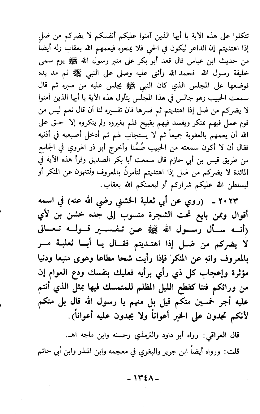 2023 - (روي عن أبي ثعلبة الخشني رضي الله عنه) في اسمه أقوال وممن بايع تحت الشجرة منسوب إلى جده خشن بن لأي (أنه سأل رسول الله - صلّى الله عليه وسلم - عن تفسير قوله تعالى لا يضركم من ضل إذا اهتديتم فقال يا أبا ثعلبة مر بالمعروف وانهِ عن المنكر فإذا رأيت شحا مطاعا وهوى متبعا ودنيا مؤثرة وإعجاب كل ذي رأي برأيه فعليك بنفسك ودع العوام إن من ورائكم فتنا كقطع الليل المظلم للمتمسك فيها بمثل الذي أنتم عليه أجر خمسين منكم قيل بل منهم يا رسول الله قال بل منكم لأنكم تجدون على الخير أعواناً ولا يجدون عليه أعواناً).