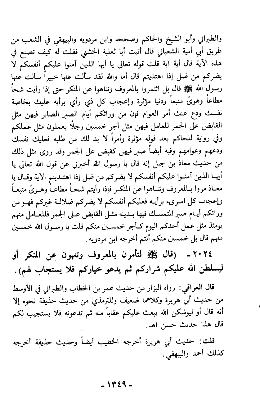 والطبراني وأبو الشيخ والحاكم وصححه وابن مردويه والبيهقي في الشعب من طريق أبي أمية الشعباني قال أتيت أبا ثعلبة الخشني فقلت له كيف تصنع في هذه الآية قال أية آية قلت قوله تعالى يا أيها الذين آمنوا عليكم أنفسكم لا يضركم من ضل إذا اهتديتم قال أما والله لقد سألت عنها خبيراً سألت عنها رسول الله - صلّى الله عليه وسلم - قال بل ائتمروا بالمعروف وتناهوا عن المنكر حتى إذا رأيت شحاً مطاعاً وهوىً متبعاً ودنيا مؤثرة وإعجاب كل ذي رأي برأيه عليك بخاصة نفسك ودع عنك أمر العوام فإن من ورائكم أيام الصبر الصابر فيهن مثل القابض على الجمر للعامل فيهن مثل أجر خمسين رجلاً يعملون مثل عملكم وفي رواية للحاكم بعد قوله مؤثرة وأمراً لا بد لك من طلبه فعليك نفسك ودعهم وعوامهم وفيه أيضاً صبر فيهن كقبض على الجمر وقد روى مثل ذلك من حديث معاذ بن جبل إنه قال يا رسول الله أخبرني عن قول الله تعالى يا أيها الذين آمنوا عليكم أنفسكم لا يضركم من ضل إذا اهتديتم الآية وقال يا معاذ مروا بالمعروف وتناهوا عن المنكر فإذا رأيتم شحاً مطاعا وهوىً متبعاً وإعجاب كل امرئ برأيه فعليكم أنفسكم لا يضركم ضلالة غيركم فهو من ورائكم أيام صبر المتمسك فيها بدينه مثل القابض على الجمر فللعامل منهم يومئذ مثل عمل أحدكم اليوم كأجر خمسين منكم قلت يا رسول الله خمسين منهم قال بل خمسين منكم أنتم أخرجه ابن مردويه.