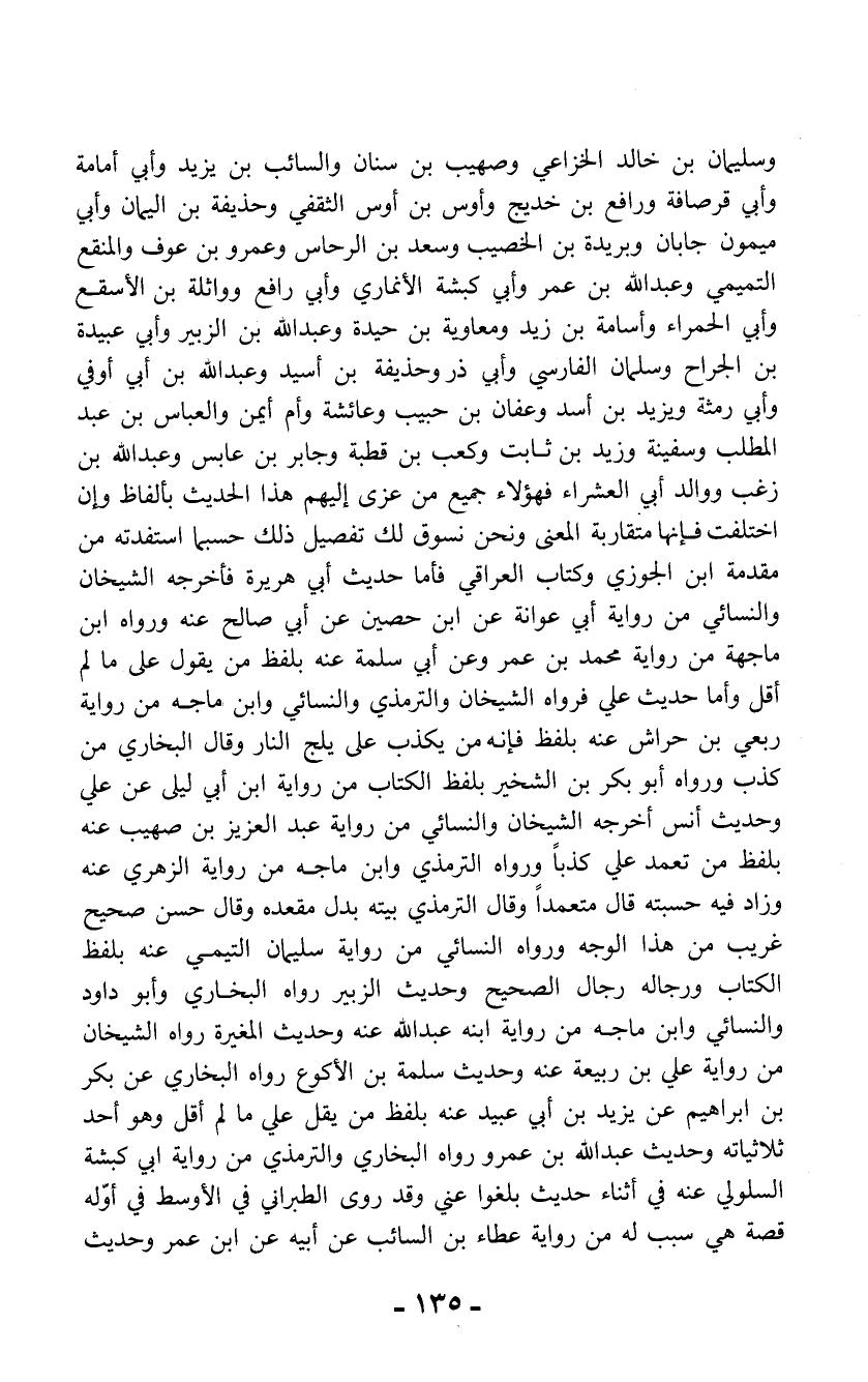 وسليمان بن خالد الخزاعي وصهيب بن سنان والسائب بن يزيد وأبي أمامة وأبي قرصافة ورافع بن خديج وأوس بن أوس الثقفي وحذيفة بن اليمان وأبي ميمون جابان وبريدة بن الخصيب وسعد بن الرحاس وعمرو بن عوف والمنقع التميمي وعبد الله بن عمر وأبي كبشة الأنماري وأبي رافع وواثلة بن الأسقع وأبي الحمراء وأسامة بن زيد ومعاوية بن حيدة وعبد الله بن الزبير وأبي عبيدة بن الجراح وسلمان الفارسي وأبي ذر وحذيفة بن أسيد وعبد الله بن أبي أوفي وأبي رمثة ويزيد بن أسد وعفان بن حبيب وعائشة وأم أيمن والعباس بن عبد المطلب وسفينة وزيد بن ثابت وكعب بن قطبة وجابر بن عابس وعبد الله بن زغب ووالد أبي العشراء فهؤلاء جميع من عزى إليهم هذا الحديث بألفاظ وإن اختلفت فإنها متقاربة المعنى ونحن نسوق لك تفصيل ذلك حسبما استفدته من مقدمة ابن الجوزي وكتاب العراقي فأما حديث أبي هريرة فأخرجه الشيخان والنسائي من رواية أبي عوانة عن ابن حصين عن أبي صالح عنه ورواه ابن ماجهة من رواية محمد بن عمر وعن أبي سلمة عنه بلفظ من يقول على ما لم أقل وأما حديث علي فرواه الشيخان والترمذي والنسائي وابن ماجه من رواية ربعي بن حراش عنه بلفظ فإنه من يكذب على يلج النار وقال البخاري من كذب ورواه أبو بكر بن الشخير بلفظ الكتاب من رواية ابن أبي ليلى عن علي وحديث أنس أخرجه الشيخان والنسائي من رواية عبد العزيز بن صهيب عنه بلفظ من تعمد علي كذباً ورواه الترمذي وابن ماجه من رواية الزهري عنه وزاد فيه حسبته قال متعمداً وقال الترمذي بيته بدل مقعده وقال حسن صحيح غريب من هذا الوجه ورواه النسائي من رواية سليمان التيمي عنه بلفظ الكتاب ورجاله رجال الصحيح وحديث الزبير رواه البخاري وأبو داود والنسائي وابن ماجه من رواية ابنه عبد الله عنه وحديث المغيرة رواه الشيخان من رواية علي بن ربيعة عنه وحديث سلمة بن الأكوع رواه البخاري عن بكر بن إبراهيم عن يزيد بن أبي عبيد عنه بلفظ من يقل علي ما لم أقل وهو أحد ثلاثياته وحديث عبد الله بن عمرو رواه البخاري والترمذي من رواية أبي كبشة السلولي عنه في أثناء حديث بلغوا عني وقد روى الطبراني في الأوسط في أوّله قصة هي سبب له من رواية عطاء بن السائب عن أبيه عن ابن عمر وحديث
