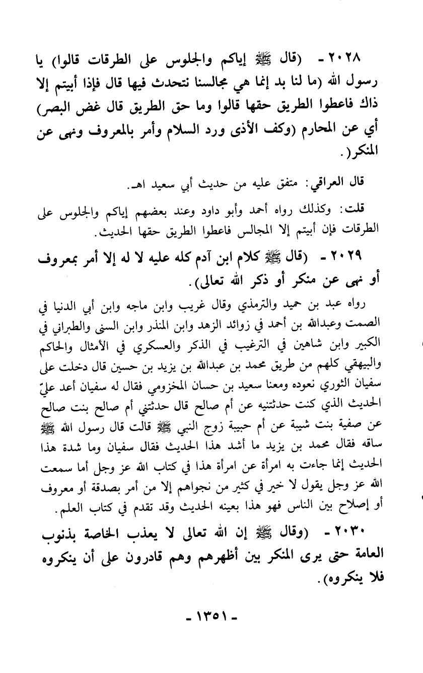 2028 - (قال - صلّى الله عليه وسلم - إياكم والجلوس على الطرقات قالوا) يا رسول الله (ما لنا بد إنما هي مجالسنا نتحدث فيها قال فإذا أبيتم إلا ذاك فاعطوا الطريق حقها قالوا وما حق الطريق قال غض البصر) أي عن المحارم (وكف الأذى ورد السلام وأمر بالمعروف ونهى عن المنكر).